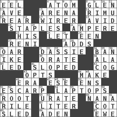 ACROSS 1. Snakelike fish 4. Tiny particle 8. Small, secluded valley 12. "___ Maria" 13. Sports stadium 14. Tall New Zealand timber tree 15. Rump 17. One who wires 18. Enthusiastic 19. Paper fasteners 21. Electrical Unit 23. Part of HMS, perhaps 24. Allow 26. Car or cant ending 27. Painter Guido (1575-1642) 28. Sums up 30. Rowing implement 31. Hyrax 34. Forbid 37. Mamie's mate 38. Declaim 39. Chicken ___ king 40. Directed 41. Had an oblique or slanted direction 42. Gear tooth 43. Elects 44. Create 46. Epoch 47. Compass dir. 50. Followers of ems 51. Fortification 54. Portable computers 57. Carrot, for example 58. A salt of uric acid 60. Nanny 62. Cause heat under the collar 63. 61 cubic inches 64. Small bed 65. Downhill vehicle 66. An important port of Yemen 67. She-sheep DOWN 1. Ewer handle 2. Nights before holidays 3. Tough but pliablecoriaceous 4. Satellite of Uranus 5. Laconic 6. Single 7. Hindu Mythology: god of death 8. Raisin fruits 9. Make or become more lively 10. Arab leader 11. Unadorned 13. Leather borer 16. Precipitation 20. Air pressure measure (abbr.) 22. Ancient Persian 25. Clothes sense 27. Immoral or dissolute person 29. Passed on 30. Lubricate 31. Stupid person 32. Came up 33. Plant excrement 34. Keyboard key 35. Medicinal plant 36. Tired old horse 41. Coast Guard woman 43. Declaimed 44. Was introduced to 45. Soon (poet.) 46. Learning spot: Fr. 48. Schedule 49. Consumed 51. Blunders 52. Land 53. Monetary unit of Botswana 55. For each 56. Frozen precipitation 59. To free from 61. Had dinner