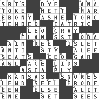 ACROSS 1. Indian titles of respect 5. Color 8. Santa ___, CA 11. Puff or smoke 12. Remaining after all deductions 14. Spoil 15. Dark wood 17. American tennis player Robert 18. Torque (variant) 19. Looked after 21. Of or pertaining to medicine 23. Lion 25. Supercomputer manufacturer 26. Liveliness 27. Fast jet (abbr.) 28. Chief or king in Benin or Nigeria 31. Direct toward a target or goal 33. Portuguese money of account (variant) 35. Small island 37. Opposed to 38. Filthy place 40. Toward shelter 41. Theater features 43. Corporate head (abbr.) 45. Slender fish 46. Leather borer 47. Adept person 50. Flaplike coverings 52. At sea 53. Travel a route regularly 54. Sunflower state 56. Sounds asleep 61. Grant temporary use of 62. Sew up the eyelids of hawks and falcons 65. Eat (away) 66. Car or cant ending 67. Otherwise 68. Set down 69. Compass dir. 70. Put into a specified state 71. Perceives with the eye DOWN 1. Proofreading order 2. Loose flowing garment 3. Picture 4. Post 5. Heredity factor (abbr.) 6. It is so 7. Principles of right and wrong 8. Mine, in Marseilles 9. Drug cop 10. Curve 13. Pulls into pieces 16. Shout 18. Attempt 20. Letter starter 22. Jacques of French films 24. Washington bills 26. Send forth 28. Water jar 29. Fermented drink made from hops 30. Had dinner 31. Afresh 32. Slanted text style (abbr.) 34. And so on (abbr.) 36. Droops 37. White ___ sheet 39. Sharp bark 42. Backtalk 44. Petroleums 48. Desist 49. Artist's stands 51. Centimeter-gram-second unit of force 52. Added to 54. Peachy ____! 55. Singer Murray 57. Mouths or openings 58. Hero or heavy, e.g. 59. Singer Brickell 60. Arranges properly for use 61. Area sheltered from the wind 63. Compass dir. 64. Allow