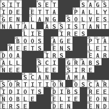 ACROSS 1. Be seated 4. Put into a specified state 7. Sinks 11. Binary compound 12. Singer James 13. Friendly 14. Commissioned mil. rank 15. Austrian-born American filmmaker Fritz 16. Finds the solution 17. Relating to or accompanying birth 19. Helper 21. Falsehood 23. Angers 24. Scornful sounds 25. Grow older 26. Parent Teacher Assoc. 29. Confronts 30. Followers of ems 31. Luau accessory 32. ___ good deed 33. Big collection agency 34. Ewer handle 35. Everything 36. _-fi 37. Takes hold of 40. Born 41. Area sheltered from the wind 42. Father 43. Skim 45. Housemaid (var.) 46. Making a chance decision by using lots 51. Motion picture award 55. Foolish or stupid persons 56. Claim 58. To riddle 59. Having high moral qualities 60. Writer Wiesel 61. Age 62. Celtic language 63. Lair 64. Conclusion DOWN 1. Public display of a written message 2. The main thing one is thinking about 3. Portable shelter 4. R.R. building 5. Inactive volcano in Sicily 6. Labels 7. Table seasonings 8. Inventor's middle name 9. Small, secluded valley 10. System (abbr.) 12. American author Paul (1891-1958) 13. Airs 16. Founders of families 18. _ vera 20. Attaches a signature 22. Double-curved letter 24. Calif. Air Force Base 25. Nest on high 26. First-year military academy student 27. Beverages made from leaves 28. Wind 29. Undercover agent 32. Daniel's nick name 33. Ancient Celtic tribe of eastern Britain 36. Narrow boards 37. Girls' org. (abbr.) 38. Full of chinks, cracks, or crevices 39. Ancient river in northeast Turkey 43. Fur scarf 44. Quote 46. Trig term 47. Scent 48. Chest bones 49. Wrote a lyric poem 50. Mediterranean tributary 52. Algonquian 53. Period of immesurable duration 54. Tear apart 57. Storage container