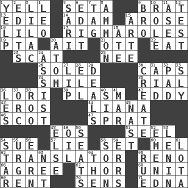 ACROSS 1. Shout 5. Bristle 9. Naughty child 13. Singer Brickell 14. First of billions? 15. Came up 16. _ and Stitch 17. Frustrating wastes of time 19. Parent Teacher Assoc. 20. Small island 21. Baseball player Mel 22. Ingest 23. Scram, to a cat 25. Born 26. Having a sole or soles 30. Smile enhancers 34. Grin 35. Monetary unit of Yemen 36. Australian parrot (variant) 39. Suffix with ecto or cyto 42. Whirlpool 43. Greek god of love 44. Woody, climbing, usually tropical plant 46. Native of Scotland 47. Small fatty European fish 48. Greek goddess of the dawn 51. Stitch closed the eyes of (a falcon) 54. Take to court 57. Whopper 58. Arrange properly for use 60. Cartoonist voice _ Blanc 62. Interpreter 65. Western Nevada city 66. Match 67. Son of Odin 68. A single undivided whole 69. Monthly bill 70. Elected reps. 71. Pulitzer Prize-winning author Ferber DOWN 1. Sharp bark 2. Proofreads 3. Pale purple color 4. Lion 5. Indian skirt 6. Prepare for publication 7. Label 8. ID or VA city 9. Sis' sibling 10. Hero or heavy, e.g. 11. At sea 12. Trial 15. Johnson of "Laugh-In" 18. Had dinner 20. Tiny particle 24. Aid 27. Mouth edge 28. Pipe bend 29. Allots cards 30. Make 31. Help 32. Groovy apt. 33. Mischievous 36. French article 37. The grampus (Milton) 38. Friend of Pooh 40. Small drink 41. Third mo. 45. Political cartoonist Thomas 48. Otherwise 49. Lubricate 50. Theater features 52. Make improvements or corrections to 53. Soviet premier 1918-24 54. Play the lead 55. Goad 56. Merit 58. Within a short period 59. Blunders 61. Globular water bottle used in Asia 63. Fish or hair follower 64. Definite Article 65. Regret