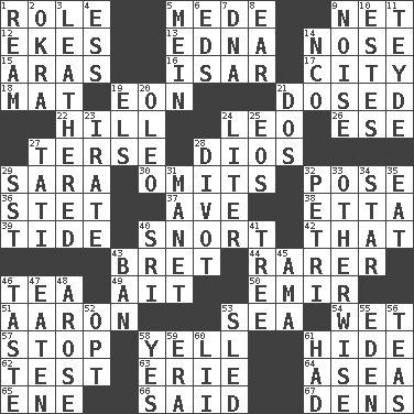 ACROSS 1. Hero or heavy, e.g. 5. Ancient Persian 9. Fish or hair follower 12. Makes supply last 13. Pulitzer Prize-winning author Ferber 14. Characteristic smell of wine 15. Ancient river in northeast Turkey 16. Austrian river, tributary to the Danube 17. Municipality 18. Floor protector 19. Period of immesurable duration 21. Administered medicine 22. Land elevation 24. Lion 26. Compass dir. 27. Laconic 28. "Vaya con ____" 29. "Two Mules for Sister ____" 30. Leaves out 32. Airs 36. Proofreading order 37. "___ Maria" 38. Singer James 39. Event that recurs at intervals 40. Derisive sound 42. Not this but _ 43. Cy Young winner Saberhagen 44. More uncommon 46. Beverage made from leaves 49. Small island 50. Arab leader 51. Composer Copland 53. Ocean 54. Soggy 57. Obstruct or block passage 58. Shout 61. Flintstone garb 62. Trial 63. One of the Great Lakes 64. At sea 65. Compass dir. 66. Alleged 67. Cub Scout units DOWN 1. 480, 500 or 516 sheets of paper 2. Gumbo ingredient 3. Resembling or made to resemble leather 4. Curvy letter 5. Count _ (2 wds.) 6. Begley and Asner 7. Heredity factor (abbr.) 8. Hearing organ 9. Annoying sound 10. _____ Park, CO 11. Miss Universe 1986, Barbara Palacios _ 14. Non-commissioned officer (abbr.) 19. Raised railways 20. Margarine 21. Two (Sp.) 23. Feeling or showing extreme anger 24. 61 cubic inches 25. Greek goddess of the dawn 27. Jacques of French films 28. A piece of turf (Scot.) 29. Fast jet (abbr.) 31. French painter Edouard 32. _ dish (used to culture cells) 33. Else 34. Play the lead 35. Erode 40. Indian title of respect (Mr.) 41. Woody plant 43. Prohibit 45. Nanny (var.) 46. Clothes sense 47. Consumed 48. Came up 52. Choose 53. Downhill vehicle 55. Genesis locale 56. Beverages made from leaves 58. Consenting reply 59. Epoch 60. Cards in a Roman deck? 61. Possessed