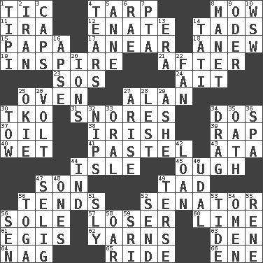 ACROSS 1. Nervous spasm 4. Canvas cover 8. Cut the grass 11. Lyricist Gershwin 12. Maternal 14. Bits 15. Dad 17. Approach 18. Afresh 19. Motivate 21. Following 23. Mayday 24. Small island 25. Baking chamber 27. ____ Jay Lerner 30. Ring climax 31. Sounds asleep 34. Two (Sp.) 37. Petroleum 38. From or relating to Ireland 39. Hit sharply and swiftly 40. Dripping 41. Soft color 43. _ moment's notice (2 wds.) 44. Small island 45. Ending for "Through" and "Enough" 47. Boy, to dad 49. Bit 50. Looks after 52. Elected representative 56. Not divided or shared with others 57. Failure 60. Welles in "The Third Man" 61. Armor plate that protects the chest 62. Entertaining tales 63. Lair 64. Tired old horse 65. Travel on an animal 66. Compass dir. DOWN 1. Native american tent (variation) 2. SW Asia republic 3. Balmoral and tarboosh 4. Pulls into pieces 5. Queen of England 1702-14 6. Actress Charlotte 7. Parent Teacher Assoc. 8. French painter Edouard 9. Baltic tributary 10. Compass dir. 13. Period 14. Jacques of French films 16. Domed church section 20. Charged atoms 22. Avid follower 25. Migrant worker of the '30s 26. Electrical Unit 27. Get up 28. For fear that 29. American tennis player Robert 30. Pull behind 32. Pinches, bites 33. Relating to the mouth 34. To trail on the ground 35. Pledge 36. Health resort 42. Grant temporary use of 44. Working for oneself (abbr.) 46. Freehold land 47. Major League Baseball Commissioner Bud 48. Washington bills 49. Laconic 50. Ancient Roman robe 51. Secret 52. Transmit 53. Event that recurs at intervals 54. Presage 55. French philosopher Descartes 56. Elected rep. 58. Rowing implement 59. Indian title of respect (Mr.)