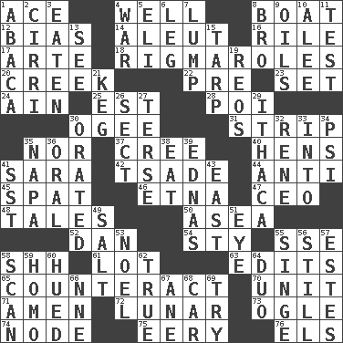 ACROSS 1. Adept person 4. Water source 8. Water vessel 12. Prejudice 14. Eskimo relative 16. Cause heat under the collar 17. Johnson of "Laugh-In" 18. Complicated, petty procedures 20. Small stream 22. Before (prefix) 23. Arrange properly for use 24. The 18th letter of the Arabic alphabet 25. Eastern Standard Time (abbr.) 28. Luau course 30. Double curve, resembling the letter S 31. Remove all contents or possession from 35. Or not 37. Algonquian 40. Coop moms 41. "Two Mules for Sister ____" 42. Sadhe (variant) 44. Opposed to 45. Argument over a trivial matter 46. Inactive volcano in Sicily 47. Corporate head (abbr.) 48. Stories 50. Toward the sea 52. One of the 12 tribes of Israel 54. Filthy place 55. Compass dir. 58. Quiet! 61. Car dealer's back yard 63. Proofreads 65. Neutralize 70. A single undivided whole 71. So be it 72. Type of eclipse 73. Stare at amorously 74. Thickened enlargement 75. Suggestive of the supernatural 76. Raised railways DOWN 1. Phillipine bananalike plant 2. High-altitude cloud 3. Consumed 4. Armed conflict 5. Biblical high priest 6. Part of a journey 7. Mass 8. Sis' sibling 9. Lubricates 10. Toward shelter 11. Trial 13. Observe 15. Canvas cover 19. Vintage cars 21. Barrel 26. Religious group 27. Laconic 29. New York city 30. Spoke pompously 32. French philosopher Descartes 33. To the inside or interior of 34. 23rd letter of the Greek alphabet 35. California wine valley 36. Spoken 38. Ingest 39. Ferber et al. 41. Fast jet (abbr.) 43. 90 degrees 49. Table seasoning 51. Sight organ 53. Christmas carol 55. Burn superficially 56. Free of sound 57. _____ Park, CO 58. Glance over 59. Same (prefix) 60. Became colored 62. Loyal 64. Superhero pair 66. Compass dir. 67. One (Scot) 68. Automobile 69. Attempt to accomplish something