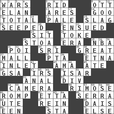 ACROSS 1. Armed conflicts 5. To free from 8. Baseball player Mel 11. Flair 12. Ancient Greek god of war 14. Thick or sticky substance 15. Add up to 17. Light colored 18. Volcanic refuse 19. Oozed 21. Followed as a consequence or result 23. Be seated 25. Casino tip 26. Portico 27. Period 28. Basketball assoc. 31. Luau course 33. Indian title of respect (Mr.) 35. Relatively large 37. Shopping center 38. Parent Teacher Association (abbr.) 40. Inactive volcano in Sicily 41. An arm off of a larger body of water 43. Housemaid (var.) 45. Had dinner 46. Girls' org. (abbr.) 47. Big collection agency 50. Austrian river, tributary to the Danube 52. Of or related to the anus 53. HTML Container Element 54. Device for capturing images 56. Full of chinks, cracks, or crevices 61. Play 62. Singer James 65. Father Junipero _ 66. Shoshoni 67. It's straight from the horse's mouth 68. Raised platform 69. Car or cant ending 70. R.R. building 71. Otherwise DOWN 1. Soaks 2. _ vera 3. Assign a rank or rating to 4. Fastener 5. Reproach for some lapse or misdeed 6. Retirement account (abbr.) 7. Erase 8. Stare 9. Frog relative 10. Coat; cloak 13. Sir (Sp.) 16. For fear that 18. Take to court 20. "Vaya con ____" 22. Heroin 24. Canvas cover 26. Filth; sediment 28. Remaining after all deductions 29. Object of repulsion 30. "One Day ___ Time" 31. Baking dishes 32. Spanish pot 34. Call ___ day 36. Rump 37. Russian fighter aircraft 39. Among 42. Prong on a fork 44. SW Saudi Arabia district 48. More uncommon 49. Chalkboards 51. Advice 52. Electrical Unit 54. ____ d'Azur (French Riviera) 55. So be it 57. Ancient Persian 58. Spoken 59. Indian titles of respect 60. Relaxation 61. Sorrow 63. Teat (slang) 64. Santa ___, CA