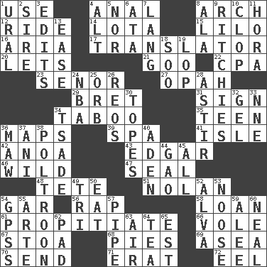 ACROSS 1. Purpose 4. Of or related to the anus 8. Bowlike part 12. Travel on or in a vehicle 14. Globular water bottle used in Asia 15. _ and Stitch 16. Roberta Peters solo 17. Interpreter 20. Allows 21. Thick or sticky substance 22. Numbers guy (abbr.) 23. Sir (Sp.) 27. Brightly colored fish 29. Cy Young winner Saberhagen 31. Attach a signature 34. Off limits 35. Adolescent 36. Atlas contents 39. Health resort 41. Small island 42. Small Philippine buffalo 43. _ Allan Poe 46. Rampant 47. Lick closed 48. False hair 51. Pitcher Ryan 54. Slender fish 56. Reproach for some lapse or misdeed 58. Grant temporary use of 61. Conciliate 66. Grand slam 67. Portico 68. Sliced desserts 69. Toward the sea 70. Post 71. Part of Q.E.F. 72. Snakelike fish DOWN 1. Mountain range 2. Title for a man of rank and authority 3. Proofreads 4. The first octave above the treble staff 5. Not either 6. "One Day ___ Time" 7. Long (Scottish) 8. Wing 9. Actors Guy, Robert Welles, and Clint 10. Hoof sound 11. Israeli folk dance 13. Comfort 18. "Barney Miller" actor Jack 19. Trim (branches) 24. Basketball assoc. 25. Globe 26. Vintage cars 28. Being in motion 30. Drinks excessively 32. Set 33. Compass dir. 34. Sadhe (variant) 36. Informal term for the mouth 37. Cuckoo 38. Coward 40. An important port of Yemen 44. E Mali city 45. 100% 49. Three (prefix) 50. Erode 52. Inventor's middle name 53. Trap for birds or small mammals 54. Global Positioning Systems (abbr.) 55. Johnson of "Laugh-In" 57. Corncob 59. Toward shelter 60. Anneal 62. Groovy apt. 63. Atmosphere 64. Afternoon social gathering 65. Eastern Standard Time (abbr.)