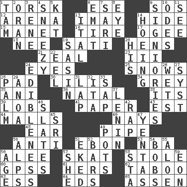 ACROSS 1. Cod relative 6. Compass dir. 9. Mayday 12. Sports stadium 13. "If ____ say so..." 14. Flintstone garb 15. French painter Edouard 16. Hoop that covers a wheel 17. Double curve, resembling the letter S 18. Born 19. Suttee (variant) 20. Coop moms 21. Ardor 23. One more than two 24. Snake ____ (dice throw) 25. Overwhelms 28. Groovy apt. 30. Ms. Damita and namesakes 34. Jennifer or Joel 35. Black tropical American cuckoo 36. Relating to or accompanying birth 38. ___ a Wonderful Life 39. Tennis shots 41. Some stationery 43. Eastern Standard Time (abbr.) 44. Shopping centers 46. Negative votes 48. Hearing organ 49. Corncob 50. Against 51. Inky black, to poets 53. Basketball assoc. 56. Toward shelter 57. Three-handed card game 58. Fur scarf 60. Global Positioning Systems (abbr.) 61. Possessive pronoun 62. Off limits 63. Double-curved letter 64. Begley and Asner 65. NE Netherlands city DOWN 1. Scottish cap 2. NW Algerian seaport 3. French philosopher Descartes 4. Dwarf with a sinus problem 5. Krazy ___ of comics 6. Send forth 7. Indian skirt 8. Sight organ 9. Seigniories (variant) 10. Lyric poems 11. Perceive with the eye 13. Slanted text style (abbr.) 14. Weeding 19. Indian antelope 20. Part of HMS, perhaps 22. Snakelike fish 24. The property of being fit to eat 26. Moistens 27. System (abbr.) 28. Inside of hand 29. Small Philippine buffalo 31. Pet locale 32. Call ___ day 33. Plant excrement 37. Soviet premier 1918-24 40. Chalkboards 42. Hit sharply and swiftly 45. _ Lanka 47. Gossips 49. Cooking vessels 50. High mountains 51. Supplemented with great effort 52. Soap units 54. Moves up and down 55. _ vera 56. Ripen 57. A female animal or person 58. R.R. building 59. Period of immesurable duration