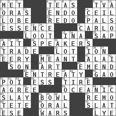 ACROSS 1. Was introduced to 4. Beverages made from leaves 8. Federal power corp. 11. Mouths or openings 13. Inside; within (prefix) 14. To provide with a ceiling 15. Ear part 16. Do over again 17. Friends 18. Core 21. Monte _, Las Vegas Hotel/Casino 22. Spoils 23. _ tizzy (2 wds.) 25. Plant excrement 26. Small island 29. Orators 32. Buy and sell 34. Car dealer's back yard 35. Electrically charged atom 38. Suggestive of the supernatural 39. Intended 41. Mountain range southwest of Kyrgyzstan 43. Male offspring 44. Nonscientific branch of learning 45. Make improvements or corrections to 46. Plea 50. E Mali city 51. Luau course 54. Double-curved letter 55. Become fatigued 57. Match 59. Pertaining to the sea 63. Kill 64. Soup holder 67. San ____ (Riviera town) 68. False hair 69. Taken by mouth 70. Narrow board 71. Compass dir. 72. Armed conflicts 73. Potassium hydroxide DOWN 1. Undercover agent 2. Greek god of love 3. Bar bills 4. Cigar-shaped 5. Compass dir. 6. Say or write further 7. "Barney Miller" actor Jack 8. Lacerates 9. Country residence 10. Columnist Joseph or Stewart 12. Sew up the eyelids of hawks and falcons 14. Accounting whiz (abbr.) 19. Characteristic smell of wine 20. Police officer (slang) 21. Auto 23. Image 24. Remaining after all deductions 26. Had dinner 27. Angers 28. Edible starchy tuberous root 30. Having winglike extensions 31. Thailand, formerly 33. Unit of force 36. Cassini of fashion 37. Grandmother 39. Floor protectors 40. Blunders 42. Wedding promise 45. Jane of fiction 47. Born 48. Ringlike coral islands and reefs 49. Nervous spasm 51. Thick mixture 52. Stares at amorously 53. Feeling or showing extreme anger 56. Hearing organs 58. Sight organ 60. 1994 drama film starring Jodie Foster 61. "If ____ say so..." 62. ____ d'Azur (French Riviera) 64. Arrow shooter 65. Mouth or opening 66. Armed conflict