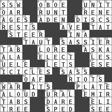 ACROSS 1. Compass dir. 4. Mitch Miller's instrument 8. A single undivided whole 12. Rowing implement 13. Undersized animal 14. French philosopher Descartes 15. Ripens 17. An important port of Yemen 18. Flat circles 19. Musical pauses 21. "___ Maria" 23. Make lace 24. Navigate 26. _ tizzy (2 wds.) 28. Tense 30. More impudent 34. Keyboard key 37. Old wives' tales, e.g. 39. "____ silly question..." 40. Chicken ___ king 41. Voters do this 43. French article 44. Ubangi River tributary 46. Allows 47. Compass dir. 48. Winter's stalactites 51. Backtalk 54. Clumsy lout 55. Debaucheries 58. Armed conflict 61. ___ a Wonderful Life 63. Food holder 65. Verbally 67. Mountain range 71. Independent ruler or chieftain 72. Bar bills 73. Have the gumption 74. Connecticut Ivy Leaguer 75. Relationship diagram 76. Hurried 77. Perceive with the eye DOWN 1. Fly high 2. Gurus 3. Take or capture by force 4. Mouth or opening 5. Partially opened flower 6. Single 7. Inactive volcano in Sicily 8. RI univ. 9. A home for chicks 10. South American Indian 11. Trial 16. Proofreading order 18. Cub Scout units 20. Ocean 22. By way of 25. Governing power 27. White ___ sheet 29. For Whom the Bell _____ 30. Religious groups 31. Small island 32. Supplements with great effort 33. To erase 34. "Change" in Tahitian 35. Actor Baldwin 36. Indonesian resort city 38. Portuguese money of account (variant) 42. Russian ruler of old 45. Environmental prefix 49. Put down 50. Lizard (obsolete) 52. Small drink 53. Not divided or shared with others 56. Softens 57. Vertical member of a panel or frame 58. Electrical Unit 59. Having or resembling wings 60. Loose flowing garment 62. Soap bubbles 64. One of the Great Lakes 66. Purpose 68. Hit sharply and swiftly 69. "We ___ not amused" (Victoria) 70. Directed
