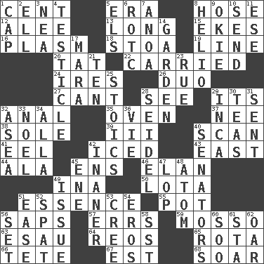 ACROSS 1. Penny 5. Epoch 8. Flexible conduit 12. Toward shelter 13. Protracted 15. Supplements with great effort 16. Suffix with ecto or cyto 18. Portico 19. Actor's bit 20. Make lace 22. Borne 24. Angers 26. Superhero pair 27. Patter 28. Perceive with the eye 29. ___ a Wonderful Life 32. Of or related to the anus 35. Baking chamber 37. Born 38. Flatfish 39. One more than two 40. Glance over 41. Snakelike fish 42. On the rocks 43. 90 degrees 44. According to 45. Followers of ems 46. Flair 49. _ tizzy (2 wds.) 50. Globular water bottle used in Asia 51. Gist 55. Plant holder 56. Plant excrements 57. Blunders 59. With motion or animation 63. Son of Isaac 64. Vintage cars 65. Roll call or roster of names 66. False hair 67. Eastern Standard Time (abbr.) 68. Fly high DOWN 1. Head covering 2. Pipe bend 3. Teachers' org. 4. One of the two male reproductive glands 5. Raised railways 6. College mil. group 7. Small Philippine buffalo 8. Sun: prefix 9. Migrant worker of the '30s 10. Post 11. Compass dir. 14. Place where plants grow 17. Hindu Mythology: god of death 21. Nine, plus one 23. Sorrow 25. Unemotional ones 28. A glass for beer 29. South American Indian 30. Afternoon social gatherings 31. Emitted 32. Toward the sea 33. Christmas carol 34. Silent film actress Nazimova 36. Compete 40. Legislators 42. More empty; more void 45. Compass dir. 47. Trim (branches) 48. Smallest unit of an element 49. Come out of 51. Relaxation 52. Argument over a trivial matter 53. Algonquian 54. Greek god of love 56. Put into a specified state 58. Fast jet (abbr.) 60. "Barney Miller" actor Jack 61. R.R. building 62. Boat paddle