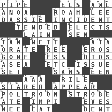 ACROSS 1. Corncob 5. Raised railways 8. Leather borer 11. Small Philippine buffalo 12. Wander 13. Area sheltered from the wind 14. Small ungulate mammals of Africa 17. Happening 19. Watched over 21. Opts 22. (Had) reclined 23. Elected rep. 24. Scottish cap 27. Remaining after all deductions 29. "One Day ___ Time" 32. Declaim 34. To sift 36. Greek god of love 37. Went 38. Double-curved letter 39. "Vaya con ____" 40. At sea 41. And so on (abbr.) 42. Come out of 43. Arrange properly for use 44. Without 46. Car or cant ending 47. American Automobile Association (abbr.) 50. Cause heat under the collar 52. A viewer who gazes fixedly 55. Become visible 57. Characterized by complete cowardliness 59. Disco prop 62. Had dinner 63. Body of Kaffir warriors 64. Nights before holidays 65. Born 66. Erode 67. Incision DOWN 1. Groovy apt. 2. _ tizzy (2 wds.) 3. Mail 4. Artist's stand 5. Age 6. Shoestrings 7. Grin 8. Actor Baldwin 9. Left 10. Allows 12. To free from 15. Empty; void 16. Singer Brickell 18. Lair 20. Main course 24. Ancient Roman robes 25. Came up 26. French painter Edouard 28. Trials 29. Ascend 30. Woman's close-fitting hat 31. NE Netherlands city 33. Beverage made from leaves 35. Fortification 36. Begley and Asner 42. Small island 45. Cuts off 47. Tate display 48. Nest on high 49. Scent 51. Having ears or earlike features 52. Connect, as a bridge 53. Lug 54. Toward shelter 55. Cuckoo 56. Be footloose 58. Elect 60. Benjamin's nick name 61. Eastern Standard Time (abbr.)