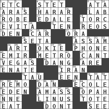 ACROSS 1. And so on (abbr.) 4. Proofreading order 8. _ moment's notice (2 wds.) 11. Ancient river in northeast Turkey 13. Ethiopian city, capital of Harari 15. Experiment locale 16. Loose flowing garment 17. Peak District village in England 18. Torque (variant) 19. Webber/Rice musical 21. "___ Little Indians" 22. Vintage cars 23. Lair 24. Auto 27. Mouth or opening 29. Bristle 30. Indian state 34. Nonscientific branch of learning 36. Migrant worker of the '30s 39. Give a jingle 40. Independent ruler or chieftain 41. Paris' subway 43. Patter 44. Viva Las _ 46. Mild oath, euphamism for damn 47. "We ___ not amused" (Victoria) 48. Related on the mother's side 49. SW Asia republic 51. The 19th letter of the Greek alphabet 53. Car or cant ending 54. Make lace 57. San ____ (Riviera town) 60. One of the 12 tribes of Israel 63. Learning spot: Fr. 65. Genesis locale 66. Collect or gather 69. Brightly colored fish 70. Compass dir. 71. "_ and Lucy" (Charlie Brown theme song) 72. Lug 73. Consume 74. Do not 75. Perceive with the eye DOWN 1. Having ears or earlike features 2. Collection of objects 3. Apartment or room in a ship 4. A female animal or person 5. Bit 6. Part of Q.E.F. 7. Falsehood 8. _ vera 9. Edible starchy tuberous root 10. Lettered men learn these first 12. Arrange properly for use 14. Former U.S. Attorney General Janet 18. File 13 20. Adept person 25. Smallest unit of an element 26. Moved through 28. Strike 29. Ski resort town in Vermont 31. Fly high 32. Singer Murray 33. Was introduced to 34. So be it 35. Port city in Latvia 37. Call ___ day 38. Bert's buddy 40. Night before a holiday 42. Legendary monster 45. Ocean 50. A saturated hydrocarbon 52. Freehold land 54. Literary convention 55. Having winglike extensions 56. Giggle 57. French philosopher Descartes 58. Pulitzer Prize-winning author Ferber 59. Confront 61. Among 62. Billionth: prefix 64. Small bed 67. Player for Phoenix 68. Fast jet (abbr.)