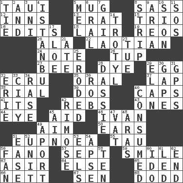 ACROSS 1. "Change" in Tahitian 5. Java container 8. Backtalk 12. Taverns 13. Part of Q.E.F. 15. Musical group of three 16. Proofreads 18. Den 19. Vintage cars 20. Chicken ___ king 22. Of or relating to Laos or its people 24. Brief written record 26. Uncastrated adult male sheep 27. Fermented drink made from hops 28. Color 29. Ovum 32. Shade of tan 35. Relating to the mouth 37. Pet locale 38. Monetary unit of Yemen 39. Two (Sp.) 40. Balmoral and tarboosh 41. It is 42. Confederate soldiers (slang) 43. Washington bills 44. Sight organ 45. Help 46. "Terrible" tsar 49. Direct toward a target or goal 50. Hearing organs 51. Normal relaxed breathing 55. The 19th letter of the Greek alphabet 56. Papal veil 57. Back-to-school mo. 59. Grin 63. SW Saudi Arabia district 64. Otherwise 65. Paradise 66. Remaining after all deductions 67. Elected rep. 68. Texas town _ City DOWN 1. Standoff 2. Added to 3. University (slang) 4. Byzantium, centuries later 5. Cartoonist voice _ Blanc 6. Mountain range 7. Greek goddess of the earth (variant) 8. Empty completely 9. Type of rug 10. The Jewish people; Israel 11. Distress signal 14. Trinitrotoluene 17. A type of plum 21. Had dinner 23. Third day of the wk. 25. Worn away 28. Small ungulate mammals of Africa 29. Liveliness 30. Yawn 31. Global Positioning Systems (abbr.) 32. 4th largest of the Great Lakes 33. Municipality 34. Raze (variant) 36. Director Reiner 40. Ingested 42. Full of chinks, cracks, or crevices 45. The 18th letter of the Arabic alphabet 47. Large container 48. Caspian sea tributary 49. To the left, to Queeg 51. Relaxation 52. A single undivided whole 53. Snakelike fish 54. Domed church section 56. Avid follower 58. "___ Little Indians" 60. Wedding promise 61. Directed 62. Conclusion