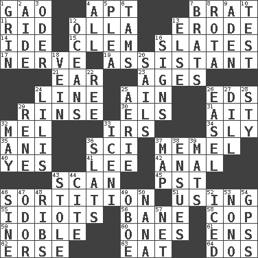 ACROSS 1. E Mali city 4. Fitting 7. Naughty child 11. To free from 12. Rounded earthenware pot or jar 13. Wear away 14. Binary compound 15. Clement's nick name 16. Chalkboards 17. Impudent aggressiveness 19. Aide 21. Hearing organ 23. Ripens 24. Actor's bit 25. The 18th letter of the Arabic alphabet 26. Begley and Asner 29. Remove soap 30. Raised railways 31. Small island 32. Cartoonist voice _ Blanc 33. Big collection agency 34. Stealthy 35. Cuckoo 36. _-fi 37. Klaipeda city 40. Consenting reply 41. Area sheltered from the wind 42. Of or related to the anus 43. Skim 45. Pacific Standard Time (abbr.) 46. Conclusion 51. Putting into practice 55. Foolish or stupid persons 56. Object of repulsion 58. Police officer (slang) 59. Impressive in appearance 60. Singles 61. Followers of ems 62. Celtic language 63. Consume 64. Two (Sp.) DOWN 1. Broad smile 2. Assistant 3. Baltic tributary 4. Everything 5. Entreaty 6. Scottish caps 7. Naughty children 8. Round or rotation of duties 9. An important port of Yemen 10. Trial 12. Seas 13. Otherwise 16. Attaches a signature 18. Distinctive style or manner 20. Moves on water 22. To riddle 24. Ms. Damita and namesakes 25. Nest on high 26. Artist's stand 27. Deli pickle 28. Filthy place 29. French philosopher Descartes 32. Fifth month 33. Ancient Celtic tribe of eastern Britain 36. Narrow boards 37. Atlas unit 38. Follows as a consequence or result 39. Floor protectors 43. Fur scarf 44. Quote 46. Trig term 47. Scent 48. Teases 49. Mitch Miller's instrument 50. Nanny 52. On the rocks 53. Words to Nanette 54. Global Positioning Systems (abbr.) 57. Fish or hair follower