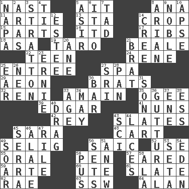 ACROSS 1. Political cartoonist Thomas 5. Small island 8. Santa ___, CA 11. Nick name for Arthur 13. R.R. building 14. Riding implement 15. Pieces 16. It would 17. Teases 18. White ___ sheet 19. Edible starchy tuberous root 21. Calif. Air Force Base 22. Adolescent 24. French philosopher Descartes 25. Main course 27. Health resort 29. A really long time 30. Naughty children 32. Painter Guido (1575-1642) 33. At full speed 35. Double curve, resembling the letter S 39. _ Allan Poe 41. Religious women 42. Marina Del _, California 43. Chalkboards 45. "Two Mules for Sister ____" 48. Draw slowly or heavily 49. Former Milwaukee Brewers owner Bud 50. Ketch in the Levant 52. Purpose 55. Of the mouth 56. Writing instrument 57. Having ears or earlike features 59. Johnson of "Laugh-In" 60. Shoshoni 61. Chalkboard 62. Actress Charlotte 63. Compass dir. 64. ____ Jay Lerner DOWN 1. California wine valley 2. Ancient river in northeast Turkey 3. Ski resort town in Vermont 4. Teat (slang) 5. SW Saudi Arabia district 6. "Tell ____ the Marines!" 7. Small amount or degree 8. Believer in; advocate of (suffix) 9. Impressive in appearance 10. Domed church section 12. First name in cosmetics 14. Algonquian 20. One (Scot) 21. Naughty child 23. Bert's buddy 25. Hearing organ 26. Born 27. Indian title of respect (Mr.) 28. Baking dish 30. Drinking establishment 31. Underwater navigation system 33. Personal question 34. Can I? 36. From the throat 37. Compass dir. 38. Double-curved letter 40. To draw with force 43. _-fi 44. Shoestrings 45. Spanish missionary in California 46. Having winglike extensions 47. Cause heat under the collar 49. Fly high 50. Puts into a specified state 51. Afresh 53. Stalk of a moss capsule 54. Locale of original sin 56. Tenth month of the Hindu calendar 58. According to