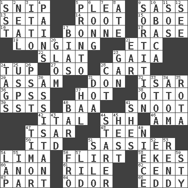 ACROSS 1. Sever or remove by pinching or nipping 5. Entreaty 9. Backtalk 13. Bristle 14. Carrot, for example 15. Mitch Miller's instrument 16. Jacques of French films 17. Child's nurse 18. Raze (variant) 19. Yearning 21. And so on (abbr.) 22. Narrow board 23. Greek goddess of the earth (variant) 24. Uncastrated adult male sheep 27. Bear (Spanish) 28. Haul 29. Indian state 31. Spanish title 32. Austrian river, tributary to the Danube 36. Global Positioning Systems (abbr.) 37. Being at a high temperature 38. "Beetle Bailey" pooch 39. Fast planes 40. Sound made by sheep 41. Snob 42. Slanted text style (abbr.) 44. Quiet! 46. Wet nurse (var.) 47. Russian ruler of old 48. Adolescent 50. It would 51. More lively and spirited 54. Pale green bean 56. Seductive woman who exploits men 58. Makes supply last 60. Soon (poet.) 61. Cause heat under the collar 62. Penny 63. Piece 64. Aroma 65. Whirlpool DOWN 1. Fast jet (abbr.) 2. Actress Patricia 3. "Tell ____ the Marines!" 4. Aches 5. Right away 6. Protracted 7. A really long time 8. Had dinner 9. Conclusion 10. Phillipine bananalike plant 11. Mayday 12. Observe 17. Prejudice 20. Take by theft 21. Hearing organ 23. Separate the seeds from cotton 24. Labels 25. United States Postal Service (abbr.) 26. Inconspicuous attention getter 28. Small bed 30. Helper 31. ___ good deed 33. Portico 34. Smallest unit of an element 35. Round or rotation of duties 37. Actor Linden 40. Oblong piece of solid material 41. "______ My Girl" (Turtles hit) 43. Small amount or degree 44. A viewer who gazes fixedly 45. Behest 47. The easternmost of the Lesser Sundas 49. Sibling's daughter 51. Grain storage tower 52. Supplemented with great effort 53. Tear apart 54. Pet locale 55. _ tizzy (2 wds.) 56. Back 57. Hat (slang) 59. Filthy place