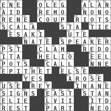 ACROSS 1. Compass dir. 4. Cassini of fashion 8. Actor Alda or Thicke 12. Assist 13. San ____ (Riviera town) 14. Words to Nanette 15. French philosopher Descartes 17. Clever action or accomplishment 18. Disturbances 19. Any of the three canals of the cochlea 21. R.R. building 23. Neckwear 24. 1973 Nobel Price Winner (Physics) Leo 26. Shoshoni 28. Nathan's nickname 30. Orator 34. Pacific Standard Time (abbr.) 37. Burrowing marine mollusk 39. Do over again 40. Call ___ day 41. Sun: prefix 43. Snakelike fish 44. Cooking vessels 46. Give a ring to 47. Compass dir. 48. Curse 51. Otherwise 54. Consenting reply 55. Came up 58. Purpose 61. Marina Del _, California 63. Empty; void 65. Attaches a signature 67. 90 degrees 71. Comedian Laurel of Laurel & Hardy 72. Writer Wiesel 73. 57 in ancient Rome 74. It would 75. Relief 76. Component 77. Modern: prefix DOWN 1. Hearing organs 2. Sibling's daughter 3. Ferber et al. 4. The grampus (Milton) 5. Lion 6. Australian flightless bird 7. Republicans 8. Black tropical American cuckoo 9. Plunder 10. Opposed to 11. Olfactory organ 16. Flair 18. Assign a rank or rating to 20. Alias (abbr.) 22. Uncastrated adult male sheep 25. Hankering 27. Hearing organ 29. Choose 30. Grin 31. Peachy ____! 32. Genesis locale 33. Hero or heavy, e.g. 34. Corncob 35. Obstruct or block passage 36. Jacques of French films 38. According to 42. Rounded earthenware pot or jar 45. Filthy place 49. Possessive pronoun 50. Compass dir. 52. _ Lanka 53. Immeasurably long periods of time 56. Smooth fabric 57. Related on the mother's side 58. One who makes use of a thing 59. Drop; flow; fall 60. Armor plate that protects the chest 62. Sharp bark 64. Inside; within (prefix) 66. Fish or hair follower 68. Actress Gardner 69. Title for a knight 70. Teat (slang)