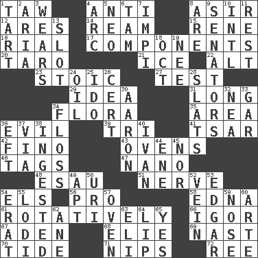ACROSS 1. The 23rd letter of the Hebrew alphabet 4. Opposed to 8. SW Saudi Arabia district 12. Ancient Greek god of war 14. 480, 500 or 516 sheets of paper 15. French philosopher Descartes 16. Monetary unit of Yemen 17. Parts 20. Pacific island yam 21. Frozen water 22. Keyboard modifier key 23. Unemotional 27. Trial 29. The content of cognition 31. Protracted 34. Plants 35. Length times width 36. Tending to cause great harm 39. Three (prefix) 41. Russian ruler of old 42. A pale, very dry sherry 43. Baking chambers 46. Labels 47. Billionth: prefix 48. Son of Isaac 51. Impudent aggressiveness 54. Raised railways 56. Adept person 58. Pulitzer Prize-winning author Ferber 61. Happening in regular succession 66. Composer Stravinsky 67. Arabian gulf 68. Writer Wiesel 69. Political cartoonist Thomas 70. Periodic rise and fall of the sea level 71. Cuts off 72. To separate or throw off DOWN 1. Small pie 2. Roberta Peters solo 3. Puts on (as clothing) 4. Curve 5. Modern: prefix 6. Scottish cap 7. Body of Kaffir warriors 8. "We ___ not amused" (Victoria) 9. Elected representatives 10. International (abbr.) 11. Take ten 13. Narrow opening 18. Sep. follower 19. Born 24. Lubricate 25. Wedding promise 26. An absolute certainty 28. Narrow boards 30. Composer Copland 32. Teachers' org. 33. Slender fish 34. Soft thread for cleaning between teeth 36. Lizard (obsolete) 37. By way of 38. Consumed 40. _ the terrible 44. Compass dir. 45. Not either 49. Fitting 50. RI univ. 52. Distinctive style or manner 53. _ Allan Poe 54. Part of Q.E.F. 55. Farming town in central California 57. Baking chamber 59. Olfactory organ 60. Johnson of "Laugh-In" 62. One (Scot) 63. Biblical high priest 64. Mouth edge 65. Consenting reply