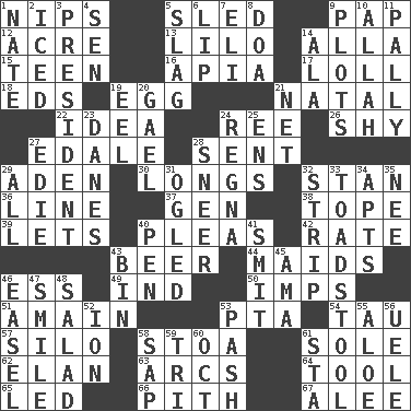 ACROSS 1. Cuts off 5. Downhill vehicle 9. Infant food 12. 1/640 square mile 13. _ and Stitch 14. Silent film actress Nazimova 15. Adolescent 16. Capital of Western Samoa 17. Hang loosely or laxly 18. Begley and Asner 19. Oval reproductive body of a fowl 21. Brizilian seaport 22. It may be bright or harebrained 24. To separate or throw off 26. Like a shrinking violet 27. Peak District village in England 28. Posted 29. Arabian gulf 30. Yearns 32. Comedian Laurel of Laurel & Hardy 36. Actor's bit 37. Commissioned military rank (abbr.) 38. Drink excessively 39. Allows 40. Entreaties 42. Pace 43. Fermented drink made from hops 44. Women servants 46. Double-curved letter 49. Working for oneself (abbr.) 50. Naughty children 51. At full speed 53. Parent Teacher Association (abbr.) 54. The 19th letter of the Greek alphabet 57. Grain storage tower 58. Portico 61. Flatfish 62. Style 63. Curves 64. Instrument 65. Directed 66. Heart or essence 67. Toward shelter DOWN 1. Nathan's nickname 2. On the rocks 3. Elected leader of a country 4. Elected rep. 5. Volcanic refuse 6. Mouth edge 7. Biblical high priest 8. ___ good deed 9. Secret plans 10. Assad's deity 11. Friendly 14. Insect wing 19. Snakelike fish 20. Highlander 21. Fish or hair follower 23. Natives or inhabitants of Denmark 24. Rain (Swedish) 25. Followers of ems 27. Singer Brickell 28. Contemptuous expression 29. Everything 31. Stared 32. Long narrow piece of something 33. Inedible or poisonous agaric 34. Flats, for short 35. Born 40. Animal enclosure 41. Stricken, poetically 43. Storage container 45. Wet nurse (var.) 46. Artist's stand 47. Grin 48. Vegetable dish 52. Electrically charged atom 53. Romantic infatuation 55. _ vera 56. Ubangi River tributary 58. Plant excrement 59. Three (prefix) 60. Sep. follower 61. R.R. building