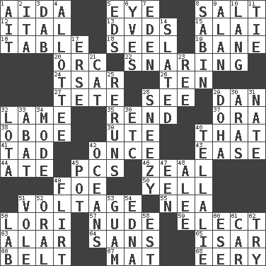 ACROSS 1. Opera by Verdi 5. Sight organ 8. Table seasoning 12. Slanted text style (abbr.) 13. Movie discs 15. Jai ____ 16. Eating place 18. Stitch closed the eyes of (a falcon) 19. Object of repulsion 20. The grampus (Milton) 22. Catching in a trap 24. Russian ruler of old 26. Nine, plus one 27. False hair 28. Observe 29. Daniel's nick name 32. Unable to walk 35. Tear apart 37. Mouth or opening 38. Mitch Miller's instrument 39. Shoshoni 40. Not this but _ 41. Small amount or degree 42. At one time in the past 43. Comfort 44. Had dinner 45. Personal Computers (abbr.) 46. Ardor 49. Enemy 50. Shout 51. Electrical Measurement 55. Teachers' org. 56. Australian parrot (variant) 57. Unadorned 59. Opt 63. Having or resembling wings 64. Without 65. Austrian river, tributary to the Danube 66. Waist strap 67. Floor protector 68. Suggestive of the supernatural DOWN 1. Small island 2. Call ___ day 3. Apply (a substance) by light strokes 4. One to whom something is allotted 5. Begley and Asner 6. Jacques Cousteau's middle name 7. Genesis locale 8. Unit of acoustic absorption 9. Actor Alda or Thicke 10. Long (Scottish) 11. Make a knot 14. Scheduled 17. Celtic language 21. Feline 23. Portuguese money of account (variant) 25. Summer TV shows 28. Dwarf with a sinus problem 29. Capital of the state of Qatar 30. Caspian sea tributary 31. Nathan's nickname 32. Globular water bottle used in Asia 33. Blind as ____ 34. Method 36. And so on (abbr.) 40. Copy Pinocchio 42. Seas 45. Plant holder 47. Car or cant ending 48. Toward shelter 49. Talk or behave amorously 51. Short-tailed, large-bodied rat 52. Spoken 53. Island territory of the United States 54. Pulitzer Prize-winning author Ferber 56. Experiment locale 58. Eastern Standard Time (abbr.) 60. Compass dir. 61. 4-wheeled motor vehicle 62. Attempt