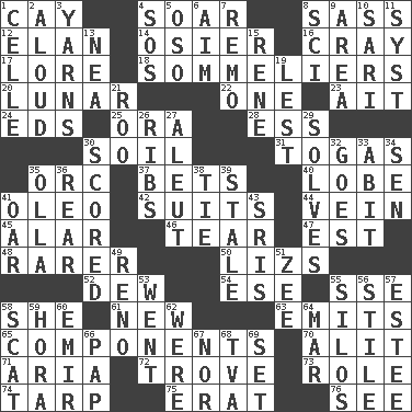ACROSS 1. Island 4. Fly high 8. Backtalk 12. Flair 14. Flexible twig of a willow tree 16. Supercomputer manufacturer 17. Old wives' tales, e.g. 18. Wine waiters 20. Type of eclipse 22. Single 23. Small island 24. Begley and Asner 25. Mouth or opening 28. Double-curved letter 30. Land 31. Ancient Roman robes 35. The grampus (Milton) 37. Stakes 40. Ear part 41. Butter sub 42. Sets of matching outer garments 44. Distinctive style or manner 45. Having or resembling wings 46. Lacerate 47. Eastern Standard Time (abbr.) 48. More valued for its uncommonness 50. Belonging to Elizabeth 52. Morning condensation 54. Compass dir. 55. Compass dir. 58. A female animal or person 61. ___ Haven, CT 63. Sends forth 65. Parts 70. Came down and settled, as after flight 71. Roberta Peters solo 72. Collection of objects 73. Hero or heavy, e.g. 74. Canvas cover 75. Part of Q.E.F. 76. Perceive with the eye DOWN 1. Cell (Danish) 2. Verbally 3. Tall tales 4. Distress signal 5. Bear (Spanish) 6. Direct toward a target or goal 7. San ____ (Riviera town) 8. _-fi 9. Type of rug 10. Indian skirt 11. System (abbr.) 13. Teachers' org. 15. French philosopher Descartes 19. For fear that 21. Friend of Pooh 26. Teases 27. Eskimo relative 29. Finds the solution 30. Tallied 32. Travels 33. "This won't hurt ____!" 34. Elected rep. 35. Water jar 36. Hitchcock's "____ Window" 38. Neckwear 39. Having lost freshness 41. Boat paddle 43. Indian titles of respect 49. Former U.S. Attorney General Janet 51. Last letter of the English alphabet 53. Left 55. Grain storage towers 56. Vertical member of a panel or frame 57. First name in cosmetics 58. Go away! 59. Israeli folk dance 60. Arab leader 62. We are 64. Make imperfect 66. Infant food 67. And not 68. Federal power corp. 69. Arrange properly for use