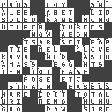ACROSS 1. Writing tablets 5. Myrna of the movies 8. _ Lanka 11. Toward shelter 12. Collude with 14. Flaplike covering 15. Having a sole or soles 17. Object of repulsion 18. Like (prefix) 19. Assistant 21. Threesomes 23. At this time 25. Period of immesurable duration 26. Russian ruler of old 27. Put into a specified state 28. Infant food 31. Standoff 33. Cartoonist voice _ Blanc 35. Garlic unit 37. Polynesian shrub of the pepper family 38. Modern: prefix 40. SW Saudi Arabia district 41. Collect or gather 43. Ovum 45. Mountains (abbr.) 46. "___ Little Indians" 47. Small child 50. Relaxation 52. Airs 53. And so on (abbr.) 54. Put through a sieve 56. Artist's stands 61. Female horse 62. Prepare for publication 65. Add up to 66. RI univ. 67. Western Nevada city 68. Chinese city south-southwest of Nanjing 69. E Mali city 70. Fool 71. Title for a man of rank and authority DOWN 1. Romantic infatuation 2. _ vera 3. Small valley 4. Ooze 5. Experiment locale 6. Chief or king in Benin or Nigeria 7. Gossips 8. _ gin 9. Basketball hoops 10. Wedding promise 13. Giggle 16. Hiding places for outlaws 18. Layer 20. Wander 22. College mil. group 24. Songbird 26. Beverages made from leaves 28. Mail 29. Deliberation 30. For each 31. Docile 32. _ the terrible 34. Area sheltered from the wind 36. Unable to walk 37. Krazy ___ of comics 39. Double curve, resembling the letter S 42. Portico 44. Yard entry 48. Flexible twig of a willow tree 49. Watched over 51. Get outta here! 52. Before (prefix) 54. "Two Mules for Sister ____" 55. Musical group of three 57. Sty mamas 58. Needle case 59. Cowardly lion portrayer 60. Turn sharply 61. Java container 63. _ tizzy (2 wds.) 64. Pull behind