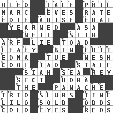 ACROSS 1. Margarine 5. Lie 9. Silvers or Donahue 13. Drug cop 14. Nights before holidays 15. Pace 16. Singer Brickell 17. Get up 18. Part of Q.E.F. 19. Felt deep pity or tenderness 21. White ___ sheet 22. Remaining after all deductions 23. Tumult 24. Sandy's bark 27. Falsehood 28. Frog relative 29. Like summer trees 31. Storage container 32. Prepare for publication 36. Pulitzer Prize-winning author Ferber 37. Third day of the wk. 38. Tender 39. Calm and collected 40. Small amount or degree 41. Lacking originality or spontaneity 42. Thailand, formerly 44. Ocean 46. Marina Del _, California 47. Religious group 48. Israeli folk dance 50. Definite Article 51. Flamboyance 54. Musical group of three 56. Runs notes together 58. Prong on a fork 60. _ and Stitch 61. Disposed of to a purchaser 62. Likelihood 63. Lacking warmth 64. Sight organs 65. Vintage cars DOWN 1. Single 2. Kenny Rogers chart-topper in '80 3. 4th largest of the Great Lakes 4. Sea 5. Cigar-shaped 6. Enthusiastic 7. French article 8. Compass dir. 9. Elected leader of a country 10. Ethiopian city, capital of Harari 11. Call ___ day 12. Allow 17. Against 20. Depend 21. _ moment's notice (2 wds.) 23. Male child 24. Actor Baldwin 25. Do over again 26. Papal veil 28. Make a knot 30. It jiggles the polygraph 31. Partially opened flower 33. Letter starter 34. Capri or Wight 35. Those things 37. Scottish cap 40. Make lace 41. "Two Mules for Sister ____" 43. Frozen water 44. Pottery fragments 45. Immeasurably long periods of time 47. Free from disturbance or agitation 49. Thespian 51. Whine 52. Flintstone garb 53. Inside; within (prefix) 54. Affectionate concern, for short 55. River (Sp.) 56. Compass dir. 57. Myrna of the movies 59. Double-curved letter