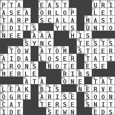 ACROSS 1. Parent Teacher Association (abbr.) 4. 90 degrees 8. RI univ. 11. Toward the sea 13. Fourth or lowest deck 15. Allow 16. Canvas cover 17. Any of the three canals of the cochlea 18. Vertical spar for supporting sails 19. Proofreads 21. Consenting reply 22. To (old English) 23. Born 24. American Automobile Association (abbr.) 27. Part of HMS, perhaps 29. Synchronize (abbr.) 30. Trials 34. Pull behind 36. Smallest unit of an element 39. Guide 40. Opera by Verdi 41. Failure 43. Jacques of French films 44. Metal shackles 46. Musical sound 47. Compass dir. 48. Haggard of country music 49. Chest bones 51. "One Day ___ Time" 53. Single 54. Make lace 57. Path through which fluid escapes 60. Again 63. Impudent aggressiveness 65. Legendary monster 66. Get up 69. Within a short period 70. Feline 71. Laconic 72. In a ____ (agitated or irritated) 73. Binary compound 74. Stitched 75. Begley and Asner DOWN 1. Eucharist need 2. Sadhe (variant) 3. Nest on high 4. Greek goddess of the dawn 5. Curve 6. Kill 7. Lacquered or enameled metalware 8. ____ Bator 9. Repose 10. "Tell ____ the Marines!" 12. Fitting 14. Romantic infatuation 18. French bagpipes 20. Declare 25. Of or related to the anus 26. NE Massachussets city 28. ___ a Wonderful Life 29. Tchaikovsky ballet 31. Oceans 32. Wig 33. _ Lanka 34. Hoop that covers a wheel 35. Aroma 37. Bear (Spanish) 38. Paris' subway 40. Direct toward a target or goal 42. It's straight from the horse's mouth 45. Put into a specified state 50. Benjamin's nick name 52. Blind as ____ 54. Marketplace scale 55. Shun 56. Portable shelters 57. Event scenes 58. Mild oath 59. Johnson of "Laugh-In" 61. Angers 62. Father 64. Curvy letter 67. Compass dir. 68. Car or cant ending