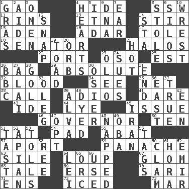 ACROSS 1. E Mali city 4. Flintstone garb 8. Compass dir. 11. Basketball hoops 13. Inactive volcano in Sicily 14. Disorderly outburst 15. An important port of Yemen 16. The sixth month of the Jewish calendar 17. Lacquered or enameled metalware 18. Elected representative 21. Auras 22. Left side of a ship or aircraft 23. Bear (Spanish) 25. Eastern Standard Time (abbr.) 26. Paper or plastic container 29. Utter; complete 32. Vital fluid 34. Observe 35. Fish or hair follower 38. Give a ring to 39. Goodbye (Sp.) 41. Have the gumption 43. Binary compound 44. Sodium hydroxide 45. Come out of 46. Head of state? 50. "___ Little Indians" 51. Make lace 54. Groovy apt. 55. Blind as ____ 57. To the left, to Queeg 59. Flamboyance 63. Drop; flow; fall 64. Central Nebraska county 67. Seize upon or latch onto something 68. Lie 69. Celtic language 70. Indian skirt 71. Followers of ems 72. On the rocks 73. Impair DOWN 1. Pate de foie ____ 2. Helper 3. Sign of something about to happen 4. Centers of feelings and intuitions 5. It would 6. Heredity factor (abbr.) 7. Ewer handle 8. Took without asking 9. Grain storage towers 10. Obtain by seizing forcibly or violently 12. Fastener 14. R.R. building 19. Frog relative 20. Globe 21. Being at a high temperature 23. Margarine 24. Takes to court 26. English channel? 27. Jai _ 28. Gilded 30. Flexible twig of a willow tree 31. Extremities 33. Cassini of fashion 36. Compass direction 37. Loyal 39. Inventor's middle name 40. Colored 42. Car or cant ending 45. SW Asia republic 47. Choose 48. Slept 49. Chief or king in Benin or Nigeria 51. Clothes sense 52. Bee-related 53. For Whom the Bell _____ 56. Labels 58. To riddle 60. Burrowing marine mollusk 61. Israeli folk dance 62. Independent ruler or chieftain 64. Flowery wreath 65. The grampus (Milton) 66. Purpose