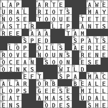 ACROSS 1. Infant locale 4. Johnson of "Laugh-In" 8. Deep reverence 11. Mountain range 13. Disturbances 15. Fifth month 16. Characteristic smell of wine 17. Woman's close-fitting hat 18. Wig 19. Moving about 21. Mouth edge 22. Pismires 23. To sift 24. American Automobile Association (abbr.) 27. Scottish cap 29. Hurried 30. Arguments over trivial matters 34. Trim (branches) 36. Lubricates 39. Nest on high 40. Be footloose 41. Parts of speech 43. French philosopher Descartes 44. Sea 46. Within a short period 47. Compass dir. 48. Pig sounds 49. Uncontrolled 51. Newt 53. Health resort 54. Apple computer (short form) 57. Having or resembling wings 60. Globe 63. Memphis, Tenn. Street 65. Chops off 66. Honkers 69. Place where flour is made 70. Ingest 71. Collect or gather 72. Freehold land 73. Followers of ems 74. Lyric poems 75. A female animal or person DOWN 1. Type of eclipse 2. Came up 3. Thick mixture 4. Tate display 5. _ de Janeiro 6. Implement 7. Needle case 8. So be it 9. Electrical Unit 10. Snake ____ (dice throw) 12. Flowery wreath 14. Back-to-school mo. 18. ________ with (broke a safety seal) 20. Strike 25. A really long time 26. Goodbye (Sp.) 28. White ___ sheet 29. Orators 31. Ancient Greek god of war 32. Prong on a fork 33. Perceive with the eye 34. Locales 35. Baking chamber 37. Nilotic language 38. Frozen precipitation (plural) 40. Friend of Pooh 42. Clip 45. Science/research agcy. 50. Experiment locale 52. Ancient Roman robe 54. Unmarried girls 55. Assad's deity 56. Cell (Danish) 57. Toward shelter 58. Grant temporary use of 59. Tenement units (abbr.) 61. San ____ (Riviera town) 62. Necklace unit 64. Australian flightless bird 67. Compass dir. 68. Double-curved letter