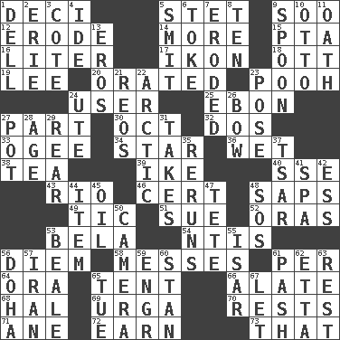 ACROSS 1. Tenth: prefix 5. Proofreading order 9. "Barney Miller" actor Jack 12. Wear away 14. Greater amount 15. Parent Teacher Association (abbr.) 16. 61 cubic inches 17. Picture 18. Baseball player Mel 19. Area sheltered from the wind 20. Spoke pompously 23. "Silly old bear" 24. One who uses or employs something 25. Inky black, to poets 27. Role in a play 30. Sep. follower 32. Two (Sp.) 33. Double curve, resembling the letter S 34. Play the lead 36. Dripping 38. Beverage made from leaves 39. Mamie's husband 40. Compass dir. 43. _ de Janeiro 46. Sure thing 48. Plant excrements 49. Nervous spasm 51. Take to court 52. Mouths or openings 53. Actor Lugosi 54. Nuclear Threat Initiatives 56. South Vietnam president (1954) 58. Makes clutter 61. For each 64. Mouth or opening 65. Portable shelter 66. Having winglike extensions 68. Actor Linden 69. Capital and largest city of Mongolia 70. Musical pauses 71. A saturated hydrocarbon 72. Merit 73. Not this but _ DOWN 1. Small valley 2. One of the Great Lakes 3. ____ d'Azur (French Riviera) 4. Binary compound 5. Stricken, poetically 6. Casino tip 7. Worn away 8. "___ Little Indians" 9. Soup utensil 10. Von Bismarck 11. Pledge 13. Greek god of love 21. Vintage cars 22. Northern region 23. Airs 24. Shoshoni 26. Ribbon knot 27. Cooking vessel 28. Grow older 29. Located in or toward the back 31. Proceeds 35. Summer TV shows 37. Russian ruler of old 41. Health resort 42. Double-curved letter 44. A distinct part 45. Petroleum 47. Wig 48. Distress signal 50. Device for capturing images 53. Memphis, Tenn. Street 55. Austrian river, tributary to the Danube 56. Capital of the state of Qatar 57. SW Asia republic 59. Engineer (abbr.) 60. Comedian Laurel of Laurel & Hardy 61. Romantic infatuation 62. Singer James 63. State of inaction 65. Third day of the wk. 67. Allow