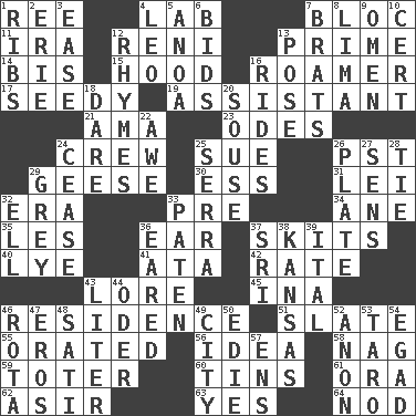 ACROSS 1. Portuguese money of account (variant) 4. Experiment locale 7. Coalition 11. Retirement account (abbr.) 12. Painter Guido (1575-1642) 13. First class 14. Altar cloth linen 15. Parka part 16. Wanderer 17. Shabby and untidy 19. Helper 21. Wet nurse (var.) 23. Lyric poems 24. Ship's personnel 25. Take to court 26. Pacific Standard Time (abbr.) 29. Honkers 30. Curvy letter 31. Luau accessory 32. Period 33. Before (prefix) 34. A saturated hydrocarbon 35. French article 36. Ewer handle 37. Burlesque acts 40. Potassium hydroxide 41. "One Day ___ Time" 42. Pace 43. Old wives' tales, e.g. 45. _ tizzy (2 wds.) 46. Home 51. Chalkboard 55. Declaimed 56. The content of cognition 58. Tired old horse 59. Carrier 60. Canisters 61. Mouth or opening 62. SW Saudi Arabia district 63. Affirmative reply 64. Allow head to fall sleepily DOWN 1. Teases 2. 4th largest of the Great Lakes 3. Comfort 4. Lion 5. Small Philippine buffalo 6. Auction offers 7. Naughty children 8. Pale green bean 9. Sign of things to come 10. Certainty 12. Poems 13. Airs 16. Amusement-park features 18. Have the gumption 20. Lush 22. Deep reverence 24. Stop 25. Spanish missionary in California 26. Food holder 27. Elected reps. 28. Make a knot 29. Jennifer or Joel 32. Pipe bend 33. Eucharist need 36. Having ears or earlike features 37. _ Lanka 38. Sunflower state 39. Slanted text style (abbr.) 43. 61 cubic inches 44. Baltic tributary 46. Round or rotation of duties 47. Greek god of love 48. Suttee (variant) 49. Municipality 50. Singer Brickell 52. At once, immediately (arch.) 53. Pacific island yam 54. Mild oath 57. Followers of ems