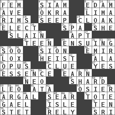 ACROSS 1. Opposite of masc. 4. Thailand, formerly 8. Dutch treat 12. "___ Maria" 13. Gumbo ingredient 14. Pale green bean 15. Basketball hoops 17. Ooze 18. Anything that covers or conceals 19. Choose 21. Health resort 23. A female animal or person 24. Killed 26. Fitting 28. Adolescent 30. Taking place subsequently 34. "Barney Miller" actor Jack 37. The Jewish people; Israel 39. Independent ruler or chieftain 40. Brine-cured salmon 41. Robbery 43. Chicken ___ king 44. Musical composition 46. A slight indication 47. Consenting reply 48. Center 51. Merit 54. Modern: prefix 55. Broken piece 58. Lion 61. _ moment's notice (2 wds.) 63. Flexible twig of a willow tree 65. Therefore, facetiously 67. Wither 71. Lug 72. Highlander 73. Small island 74. "___ Little Indians" 75. Proofreading order 76. Depend 77. _ Lanka DOWN 1. Conductor's collection 2. Vices 3. Klaipeda city 4. Mayday 5. D.D.E's nickname 6. "We ___ not amused" (Victoria) 7. Atlas contents 8. Pipe bend 9. "Vaya con ____" 10. Wet nurse 11. Create 16. Leave at once 18. Smile enhancers 20. Make a knot 22. Baking dish 25. Tender 27. Third day of the wk. 29. Sibling's daughter 30. Follow as a consequence or result 31. "If ____ say so..." 32. The longest river in the world 33. Pate de foie ____ 34. A type of plum 35. I made a mistake 36. Amu Darya 38. Lubricate 42. Beverages made from leaves 45. Elected rep. 49. Be tempered by heat 50. Small bed 52. 17th letter of the Greek alphabet 53. Political cartoonist Thomas 56. Disturbances 57. Prevent from occurring 58. Fails to keep up a pace 59. Part of Q.E.F. 60. Double curve, resembling the letter S 62. SW Saudi Arabia district 64. Painter Guido (1575-1642) 66. The first octave above the treble staff 68. Compass dir. 69. 100% 70. Marina Del _, California
