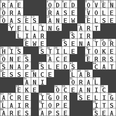 ACROSS 1. Actress Charlotte 4. Wrote a lyric poem 8. Baking chamber 12. Mouth or opening 13. Raze (variant) 14. Grand slam 15. Fertile tracts in a desert 18. Afresh 19. Otherwise 20. Crying or shouting loudly 22. Nonscientific branch of learning 23. One who doesn't tell the truth 24. Title for a knight 25. She-sheep 26. Elected representative 30. Part of HMS, perhaps 33. Vertical member of a panel or frame 36. Puff or smoke 37. Singles 39. Adept person 40. Blunders 41. Fastener 42. Bobsleighs 44. Feline 45. Core 47. Experiment locale 50. Cuckoo 51. Spoken 53. Supplement with great effort 54. Pertaining to the sea 57. 1/640 square mile 59. Composer Stravinsky 61. Major League Baseball Commissioner Bud 63. Den 64. Drink excessively 65. ___ a Wonderful Life 66. Ancient Greek god of war 67. Domed church section 68. Ocean DOWN 1. Friend of Pooh 2. Like ___ of sunshine 3. Artist's stand 4. NW Algerian seaport 5. Mild oath, euphamism for damn 6. Compass dir. 7. Morning condensation 8. Make much ado about nothing 9. Electrical Unit 10. Raised railways 11. Born 16. Writer Wiesel 17. Cole _ (cabbage dish) 21. Angers 22. The 18th letter of the Arabic alphabet 24. Perceive with the eye 26. Downhill vehicle 27. Torque (variant) 28. Gumbo ingredient 29. Repose 30. Stockings 31. Lodging establishments 32. Oceans 34. Story 35. Frozen water 38. Orators 42. _-fi 43. A type of plum 46. Compass dir. 48. Ancient river in northeast Turkey 49. Object of repulsion 52. Ms. Damita and namesakes 53. One of the Great Lakes 54. I made a mistake 55. Algonquian 56. Quote 57. Chicken ___ king 58. Auto 59. Call ___ day 60. Republican Party 62. Girls' org. (abbr.)