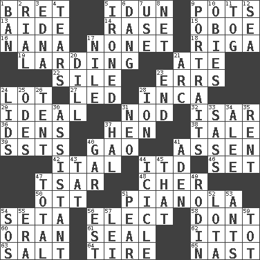 ACROSS 1. Cy Young winner Saberhagen 5. Goddess of spring and wife of Bragi 9. Cooking vessels 13. Assistant 14. Raze (variant) 15. Mitch Miller's instrument 16. Grandmother 17. Music written for nine 18. Port city in Latvia 19. Preparing or cooking with lard 21. Had dinner 22. Filth; sediment 23. Blunders 24. Car dealer's back yard 27. Directed 28. South American Indian 29. Perfect 31. Dreamland 32. Austrian river, tributary to the Danube 36. Hiding places for outlaws 37. Layer 38. Lie 39. Fast planes 40. E Mali city 41. NE Netherlands city 42. Slanted text style (abbr.) 44. It would 46. Put into a specified state 47. Russian ruler of old 48. "Mermaids" star 50. Baseball player Mel 51. Player piano 54. Stalk of a moss capsule 56. Voters do this 58. Do not 60. NW Algerian seaport 61. Lick closed 62. "Tell ____ the Marines!" 63. Table seasoning 64. Become fatigued 65. Political cartoonist Thomas DOWN 1. Prohibit 2. Monetary unit of Yemen 3. Pulitzer Prize-winning author Ferber 4. Rends 5. Pressed 6. Mild oath, euphamism for damn 7. Purpose 8. Fish or hair follower 9. Likenesses of persons 10. Off-Broadway awards 11. Coat; cloak 12. Ocean 17. "Death on the ____" 20. Deli pickle 21. Curve 23. Conclude 24. Hats (slang) 25. Lyric poems 26. Portable shelter 28. Electrically charged atom 30. Aide 31. Modern: prefix 33. Backtalk 34. Toward shelter 35. Monthly bill 37. Actor Linden 40. Slender fish 41. An important port of Yemen 43. Make lace 44. Hanging ice 45. Not this but _ 47. Add up to 49. "The Thinker" sculptor 51. Lightbulb-shaped fruit 52. Globular water bottle used in Asia 53. Pismires 54. Mayday 55. Period 56. Eastern Standard Time (abbr.) 57. Luau accessory 59. Small child