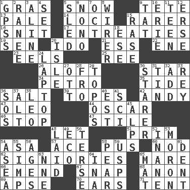 ACROSS 1. Pate de foie ____ 5. Frozen precipitation 9. False hair 13. Diluted with white 14. Venues 15. Less widely known 16. In a ____ (agitated or irritated) 17. Pleas 19. Elected rep. 20. Wedding promise 21. Double-curved letter 22. Compass dir. 23. Snakelike fish 25. To riddle 26. At or to great height 30. Play the lead 34. Stone: prefix 35. Event that recurs at intervals 36. Table seasoning 39. Drinks excessively 42. Actor Griffith 43. Margarine 44. Motion picture award 46. Halt 47. Vertical member of a panel or frame 48. Allow 51. Demure 54. White ___ sheet 57. Adept person 58. Ichor 60. Allow head to fall sleepily 62. Seigniories (variant) 65. Female horse 66. Make improvements or corrections to 67. Fastener 68. At once, immediately (arch.) 69. Domed church section 70. Hearing organs 71. Portable shelter DOWN 1. Global Positioning Systems (abbr.) 2. The wife of a rajah (variant) 3. Place in a line 4. Arrange properly for use 5. Downhill vehicle 6. Words to Nanette 7. Sep. follower 8. One who wires 9. Make lace 10. 4th largest of the Great Lakes 11. Adolescent 12. Celtic language 15. To erase 18. Compass dir. 20. Capri or Wight 24. Portable computer 27. Baseball player Mel 28. From 29. Traditional theme or motif 30. A viewer who gazes fixedly 31. Shallow baking pan 32. Find the sum of 33. Marina Del _, California 36. Mayday 37. The first octave above the treble staff 38. Lion 40. Eastern Standard Time (abbr.) 41. _-fi 45. High mountains 48. Put down 49. Environmental prefix 50. Laconic 52. Silly 53. Person of subnormal intelligence 54. At sea 55. Simple or foolish person 56. Grows older 58. Lightbulb-shaped fruit 59. United States Postal Service (abbr.) 61. Scratch 63. Compass dir. 64. _ tizzy (2 wds.) 65. Floor protector