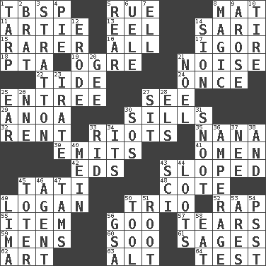 ACROSS 1. Cook's measure (abbr.) 5. Regret 8. Floor covering 11. Nick name for Arthur 13. Snakelike fish 14. Indian skirt 15. Less widely known 16. 100% 17. Russian composer Stravinsky 18. Parent Teacher Assoc. 19. Legendary monster 21. Annoying sound 22. Event that recurs at intervals 24. At one time in the past 25. Main course 27. Perceive with the eye 29. Small Philippine buffalo 30. Beverly of Met fame 32. Monthly bill 33. Debaucheries 35. Nanny 39. Sends forth 41. Sign of things to come 42. Begley and Asner 43. Slanted 45. Jacques of French films 48. ____ d'Azur (French Riviera) 49. Utah city north of Ogden 50. Musical group of three 52. Strike 55. A whole individual unit 56. Thick or sticky substance 57. Pulls apart 59. Not women's 60. "Barney Miller" actor Jack 61. Gurus 62. Nonscientific branch of learning 63. The first octave above the treble staff 64. Trial DOWN 1. Canvas cover 2. Naughty child 3. Ski resort town in Vermont 4. Sliced dessert 5. Tail end 6. Ubangi River tributary 7. Pipe bend 8. Mysterious quality of enchantment 9. Came up 10. Hoop that covers a wheel 12. Eat (away) 14. The Jewish people; Israel 20. Unit of force equal to gravity 21. Christmas carol 23. Feeling or showing extreme anger 25. Ewer handle 26. Compass dir. 27. Be seated 28. Raised railways 30. Distress signal 31. Snout, nose 33. To free from 34. ___ a Wonderful Life 36. Electrical Measurement 37. Born 38. Plus 40. Chow _ 43. _-fi 44. Plunders 45. Carrier 46. Rep 47. Scottish caps 49. Pale green bean 50. Utensil 51. Carrot, for example 53. Ancient Greek god of war 54. Inconspicuous attention getter 56. Girls' org. (abbr.) 58. Ingest