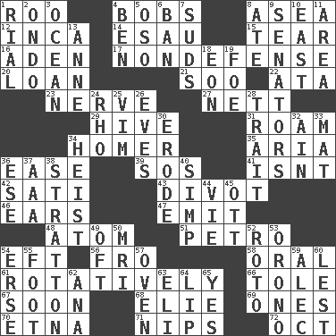 ACROSS 1. Friend of Pooh 4. Moves up and down 8. Toward the sea 12. South American Indian 14. Son of Isaac 15. Pull into pieces 16. Arabian gulf 17. Unrelated to defense, as in spending 20. Grant temporary use of 21. "Barney Miller" actor Jack 22. "One Day ___ Time" 23. Boldness 27. Remaining after all deductions 29. Hub of activity 31. Wander aimlessly 34. Baseball hit which scores a run 35. Operatic vocal solo 36. Comfort 39. Distress signal 41. Is not 42. Suttee (variant) 43. A piece of turf (Scot.) 46. Hearing organs 47. Send forth 48. Tiny particle 51. Stone: prefix 54. Bank Draft (abbr.) 56. From 58. Spoken 61. Happening in regular succession 66. Lacquered or enameled metalware 67. Within a short period 68. Writer Wiesel 69. Washington bills 70. Inactive volcano in Sicily 71. Pinches, bites 72. Sep. follower DOWN 1. Monetary unit of Yemen 2. Southwest Nigerian state 3. Sea 4. Benjamin's nick name 5. Bear (Spanish) 6. Forbid 7. Soap bubbles 8. Had dinner 9. Legislators 10. 90 degrees 11. Type of rug 13. Singer Murray 18. A really long time 19. Enemy 24. 17th letter of the Greek alphabet 25. Zeal 26. Nights before holidays 28. Distinguishing feature 30. Eat (away) 32. The 18th letter of the Arabic alphabet 33. Floor protector 34. Robbery 36. Compass dir. 37. Auto club (abbr.) 38. Ski resort town in Vermont 40. Simple or foolish person 44. Compete 45. Baseball player Mel 49. Often (poetically) 50. Medical imaging device (abbr.) 52. Printing process, for short 53. U. of Maine site 54. Celtic language 55. Lowest support of a structure 57. Baking chamber 59. Actor Baldwin 60. For fear that 62. Santa ___, CA 63. Biblical high priest 64. Mouth edge 65. Affirmative reply
