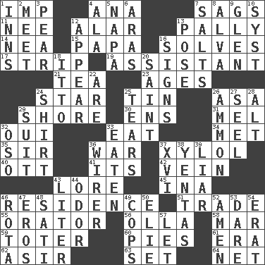 ACROSS 1. Naughty child 4. Santa ___, CA 7. Droops 11. Born 12. Having or resembling wings 13. Friendly 14. Teachers' org. 15. Dad 16. Finds the solution 17. Empty completely 19. Aide 21. Afternoon social gathering 23. Eons 24. Play the lead 25. Shallow baking pan 26. White ___ sheet 29. Dinah or Pauly 30. Followers of ems 31. Cartoonist voice _ Blanc 32. Fr. "Yes" 33. Erode 34. Was introduced to 35. Title for a knight 36. Armed conflict 37. Xylene (variant) 40. Baseball player Mel 41. It is 42. Distinctive style or manner 43. Old wives' tales, e.g. 45. _ tizzy (2 wds.) 46. Dwelling 51. Swap 55. Speaker 56. Spanish pot 58. Spoil 59. Carrier 60. Sliced desserts 61. Period 62. SW Saudi Arabia district 63. Arrange properly for use 64. Fish or hair follower DOWN 1. Lodging establishments 2. Rendezvous 3. Lightbulb-shaped fruit 4. In the manner of 5. California wine valley 6. Caspian sea tributary 7. Table seasonings 8. Inventor's middle name 9. Small, secluded valley 10. System (abbr.) 12. Seem 13. Introduce or present, as a question 16. Signals 18. "Tell ____ the Marines!" 20. Inhabitant of Heaven 22. "We ___ not amused" (Victoria) 24. Chest covering 25. Pulls apart 26. ID or VA city 27. Stitch closed the eyes of (a falcon) 28. Keyboard modifier key 29. Costume for a special activity 32. Bear (Spanish) 33. Ingested 36. One who wires 37. 16 38. Gossips 39. One who doesn't tell the truth 43. 61 cubic inches 44. Aroma 46. Round or rotation of duties 47. Greek god of love 48. Suttee (variant) 49. 911 reaches them 50. Writer Wiesel 52. So be it 53. Have the gumption 54. Part of Q.E.F. 57. Allow