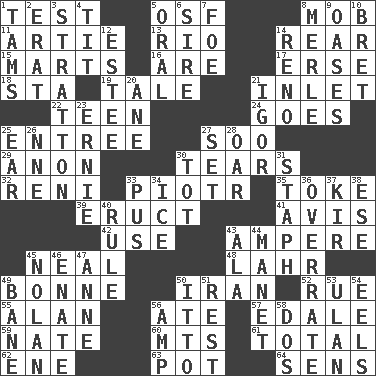 ACROSS 1. Trial 5. Order of Saint Francis (abbr.) 8. Crowd into 11. Nick name for Arthur 13. River (Sp.) 14. Hitchcock's "____ Window" 15. Shops 16. "We ___ not amused" (Victoria) 17. Celtic language 18. R.R. building 19. Lie 21. An arm off of a larger body of water 22. Adolescent 24. Moves 25. Main course 27. "Barney Miller" actor Jack 29. At once, immediately (arch.) 30. Pulls apart 32. Painter Guido (1575-1642) 33. Peter (Polish) 35. Casino tip 39. Spew [out] 41. Advice 42. Purpose 43. Electrical Unit 45. Anneal 48. Cowardly lion portrayer 49. Maid-servant 50. SW Asia republic 52. Sorrow 55. ____ Jay Lerner 56. Had dinner 57. Peak District village in England 59. Nathan's nickname 60. Mountains (abbr.) 61. Add up to 62. Compass dir. 63. Plant holder 64. Elected reps. DOWN 1. Scottish caps 2. Part of Q.E.F. 3. Ski resort town in Vermont 4. Teat (slang) 5. Relating to the mouth 6. Title for a man of rank and authority 7. Enemy 8. Haggard of country music 9. Fertile tracts in a desert 10. Cy Young winner Saberhagen 12. First name in cosmetics 14. Western Nevada city 20. One (Scot) 21. Russian composer Stravinsky 23. Bert's buddy 25. Ewer handle 26. Compass dir. 27. Arrange properly for use 28. Boat paddle 30. Small child 31. Staphylococcus 33. Ichor 34. Frozen water 36. Make much ado about nothing 37. Apertif with cassis 38. Compass dir. 40. Court order 43. Wing 44. French painter Edouard 45. Pitcher Ryan 46. Related on the mother's side 47. Queen of England 1702-14 49. Object of repulsion 50. "Tell ____ the Marines!" 51. State of inaction 53. ____ Bator 54. Snakelike fish 56. Electrical Unit 58. Two (Sp.)