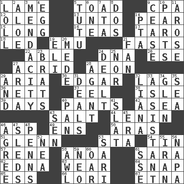 ACROSS 1. Unable to walk 5. Frog relative 9. Numbers guy (abbr.) 12. Cassini of fashion 13. To (old English) 14. Lightbulb-shaped fruit 15. Yearn 16. Afternoon social gatherings 17. Pacific island yam 18. Directed 19. Australian flightless bird 21. Goes without food and/or water 22. Competent 24. Heredity factor (abbr.) 26. Compass dir. 27. Sour-tasting 28. Period of immesurable duration 29. Operatic vocal solo 30. _ Allan Poe 32. Straggles 36. Remaining after all deductions 37. Snakelike fish 38. Capri or Wight 39. 24-hour periods 40. Leg coverings 42. Toward the sea 43. Table seasoning 44. Soviet premier 1918-24 46. Cleo's killer 49. Followers of ems 50. Caspian sea tributary 51. American astronaut and politician John 53. R.R. building 54. Shallow baking pan 57. French philosopher Descartes 58. Small Philippine buffalo 61. "Two Mules for Sister ____" 62. Pulitzer Prize-winning author Ferber 63. Put on (as clothing) 64. Fastener 65. Curvy letter 66. Australian parrot (variant) 67. Inactive volcano in Sicily DOWN 1. Hang loosely or laxly 2. Medicinal plant 3. Ananias' fault 4. Ovum 5. Ballerina skirt 6. Single 7. "One Day ___ Time" 8. Two (Sp.) 9. Desist 10. Pieces 11. Came up 14. Parent Teacher Assoc. 19. Connecticut Ivy Leaguer 20. Ancient Persian 21. Avid follower 23. Naughty children 24. Started a card game 25. Or not 27. Length times width 28. Representative 29. Also 31. Allots cards 32. Woody, climbing, usually tropical plant 33. Helper 34. Small, secluded valley 35. Ocean 40. Baking dish 41. Narrow board 43. Elected rep. 45. Period 46. Match 47. Bobsleighs 48. Actor Sean's family 52. Teachers' org. 53. Indian skirt 55. SW Asia republic 56. California wine valley 58. Leather borer 59. Modern: prefix 60. Boat paddle 61. Compass dir.