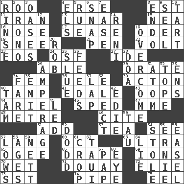 ACROSS 1. Friend of Pooh 4. Celtic language 8. Eastern Standard Time (abbr.) 11. SW Asia republic 13. Type of eclipse 15. Teachers' org. 16. Sense of smell 17. Gospel singer Marvin 18. Baltic tributary 19. Contemptuous expression 21. Animal enclosure 22. Electrical Unit 23. Greek goddess of the dawn 24. Order of Saint Francis (abbr.) 27. Binary compound 29. Competent 30. Speak pompously 34. Opposite of masc. 36. Ubangi River tributary 39. Gambison 40. Pack (down) 41. Peak District village in England 43. I made a mistake 44. Satellite of Uranus 46. Drove too fast 47. Madame (abbr.) 48. Distance measurement (Brit.) 49. Quote 51. Say or write further 53. Afternoon social gathering 54. Perceive with the eye 57. Austrian-born American filmmaker Fritz 60. Sep. follower 63. Extremist 65. Double curve, resembling the letter S 66. Window treatment 69. Charged atoms 70. Dripping 71. A city in N France, SE of Calais 72. Writer Wiesel 73. Fast jet (abbr.) 74. Corncob 75. Snakelike fish DOWN 1. Wash lightly 2. U. of Maine site 3. Fertile tracts in a desert 4. Raised railways 5. Sorrow 6. Fastener 7. Relaxation 8. Inside; within (prefix) 9. Sew up the eyelids of hawks and falcons 10. Small pie 12. Born 14. Painter Guido (1575-1642) 18. Conquer 20. Director Reiner 25. Turn sharply 26. Gives food to 28. ___ good deed 29. Electrical Measurement 31. Smallest unit of an element 32. Drink excessively 33. Followers of ems 34. Conductor's collection 35. Give off 37. Infant locale 38. Choose 40. Scottish cap 42. Singer Brickell 45. Directed 50. The 19th letter of the Greek alphabet 52. Texas town _ City 54. Fur scarf 55. Bert's buddy 56. Artist's stand 57. Moos 58. Grows older 59. Remaining after all deductions 61. Riding implement 62. "Change" in Tahitian 64. Falsehood 67. Infant food 68. Sight organ