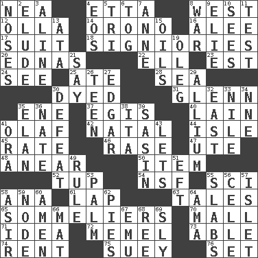 ACROSS 1. Teachers' org. 4. Singer James 8. 270 degrees 12. Spanish pot 14. U. of Maine site 16. Toward shelter 17. Costume for a special activity 18. Seigniories (variant) 20. Ferber et al. 22. Pipe bend 23. Eastern Standard Time (abbr.) 24. Perceive with the eye 25. Had dinner 28. Ocean 30. Colored 31. American astronaut and politician John 35. Compass dir. 37. The front part of a cuirass 40. (Had) reclined 41. Norwegian king 42. Brizilian seaport 44. Capri or Wight 45. Pace 46. Raze (variant) 47. Shoshoni 48. Approach 50. A distinct part 52. Uncastrated adult male sheep 54. Overdraft (abbr.) 55. _-fi 58. Santa ___, CA 61. Pet locale 63. Stories 65. Wine waiters 70. Promenade 71. The content of cognition 72. Klaipeda city 73. Competent 74. Monthly bill 75. Chop _ 76. Put into a specified state DOWN 1. Olfactory organs 2. Evade 3. Place in a line 4. Greek goddess of the dawn 5. Three (prefix) 6. Coat; cloak 7. Singer Murray 8. Armed conflict 9. Writer Wiesel 10. Perceives with the eye 11. Trial 13. _ moment's notice (2 wds.) 15. Petroleums 19. Cassini of fashion 21. Declare 26. Adolescent 27. _ Allan Poe 29. Plant genus of onion and garlic 30. Outscore 32. 90 degrees 33. Mediterranean tributary 34. Compass dir. 35. Flair 36. Nathan's nickname 38. Call ___ day 39. Indian antelope 41. Mouth or opening 43. Allows 49. General guideline 51. Lizard (obsolete) 53. Inside of hand 55. Broad, flat, thick pieces 56. Cell (Danish) 57. Small island 58. SW Saudi Arabia district 59. Connecting point 60. So be it 62. Sliced desserts 64. Housemaid (var.) 66. Floor covering 67. Australian flightless bird 68. To riddle 69. Secret