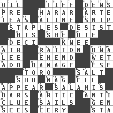 ACROSS 1. Petroleum 4. Small quarrel 8. Habitations of wild animals 12. Before (prefix) 13. Ethiopian city, capital of Harari 14. Johnson of "Laugh-In" 15. Beverages made from leaves 17. Place in a line 18. Sever or remove by pinching or nipping 19. Paper fasteners 21. Stop 23. Part of HMS, perhaps 24. A female animal or person 26. Expire 27. Tenth: prefix 28. Leg joint 30. Wind 31. Food allowance for one day 34. Heredity factor (abbr.) 37. Area sheltered from the wind 38. Make improvements or corrections to 39. Dripping 40. Increase 41. Break 42. Compass dir. 43. "Corrida" creature 44. Table seasoning 46. Quiet! 47. Tired old horse 50. Pipe bend 51. Seem 54. Deli grouping 57. Drinking establishments 58. Nick name for Arthur 60. Against 62. A slight indication 63. Moves on water 64. Commissioned mil. rank 65. Perceives with the eye 66. Suggestive of the supernatural 67. R.R. building DOWN 1. Choose 2. Angers 3. Resembling or made to resemble leather 4. Lies 5. From or relating to Ireland 6. Avid follower 7. Flintstone 8. Small ungulate mammals of Africa 9. Bert's buddy 10. Nuclear Threat Initiatives 11. Back-to-school mo. 13. Actor Linden 16. Ketch in the Levant 20. 23rd letter of the Greek alphabet 22. Locale of original sin 25. Supplementing with great effort 27. Passed on 29. Connecting point 30. Chicken ___ king 31. Bring up, as a child 32. ID or VA city 33. Afternoon social gathering 34. Homes 35. Egg locale 36. Had dinner 41. Capital of the state of Qatar 43. College papers 44. Ocean 45. _ mater 46. Disorder 48. Moving about 49. Lightheartedly 51. Lettered men learn these first 52. Light colored 53. Raze (variant) 55. French article 56. Proofreading order 59. Actress Charlotte 61. _ tizzy (2 wds.)