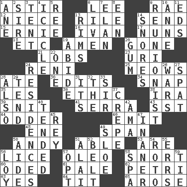 ACROSS 1. Being in motion 6. Area sheltered from the wind 9. Actress Charlotte 12. Sibling's daughter 13. Cause heat under the collar 14. Post 15. Bert's buddy 16. _ the terrible 17. Religious women 18. And so on (abbr.) 19. So be it 20. Went 21. Tennis shots 23. RI univ. 24. Painter Guido (1575-1642) 25. Catcalls? 28. Had dinner 30. Proofreads 34. Fastener 35. French article 36. Value system 38. Lyricist Gershwin 39. In a ____ (agitated or irritated) 41. Father Junipero _ 43. Fast jet (abbr.) 44. More peculiar 46. Give off 48. Compass dir. 49. Connect, as a bridge 50. Actor Griffith 51. Competent 53. "We ___ not amused" (Victoria) 56. Louse (plural) 57. Butter sub 58. Derisive sound 60. Wrote a lyric poem 61. Diluted with white 62. _ dish (used to culture cells) 63. Consenting reply 64. Teat (slang) 65. Came up DOWN 1. A saturated hydrocarbon 2. Title for a man of rank and authority 3. Portable shelter 4. Hanging ice 5. To riddle 6. Moving, as bait 7. Enthusiasm 8. Car or cant ending 9. One who advocates reunion 10. Queen of England 1702-14 11. Begley and Asner 13. Basketball hoops 14. Sounds asleep 19. Tolerate 20. Chewing product 22. Single 24. Dwellings 26. Armed conflicts 27. Petty quarrel 28. In addition 29. Be inclined (to) 31. ___ a Wonderful Life 32. Definite Article 33. Title for a knight 37. Streamer paper 40. Looked after 42. Nanny (var.) 45. Marina Del _, California 47. More lacking in sense or substance 49. _ gin 50. Assistant 51. Jai _ 52. Waist strap 54. Printing process, for short 55. Blunders 56. Myrna of the movies 57. Elect 58. Health resort 59. Make a knot