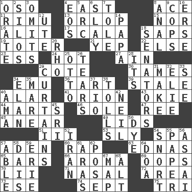 ACROSS 1. Bear (Spanish) 4. 90 degrees 8. Adept person 11. Tall New Zealand timber tree 13. Fourth or lowest deck 15. Or not 16. Set down 17. Any of the three canals of the cochlea 18. Plant excrements 19. Carrier 21. Slangy assent 22. Otherwise 23. Curvy letter 24. Being at a high temperature 27. The 18th letter of the Arabic alphabet 29. ____ d'Azur (French Riviera) 30. Corrects by punishment or discipline 34. Australian flightless bird 36. Small pie 39. Having lost freshness 40. Having or resembling wings 41. Greek mythologigal hunter 43. Migrant worker of the '30s 44. Shops 46. Flatfish 47. To separate or throw off 48. Approach 49. Flaplike coverings 51. One more than two 53. Mischievous 54. Health resort 57. Arabian gulf 60. Strike 63. Ferber et al. 65. Long, evenly shaped pieces 66. Odor 69. I made a mistake 70. Cards in a Roman deck? 71. Rhinal 72. Type of rug 73. Compass dir. 74. Back-to-school mo. 75. Three (prefix) DOWN 1. Speak pompously 2. Grain storage towers 3. Leaves out 4. Greek goddess of the dawn 5. Curve 6. Kill 7. Lacquered or enameled metalware 8. Of or related to the anus 9. 911 reaches them 10. Celtic language 12. Shoshoni 14. Dad 18. Elected representatives 20. 17th letter of the Greek alphabet 25. "Beetle Bailey" pooch 26. Lacerates 28. ___ a Wonderful Life 29. Window treatments 31. Create 32. Writer Wiesel 33. Observe 34. Flair 35. Female horse 37. _ de Janeiro 38. For Whom the Bell _____ 40. Nursemaid (var.) 42. Famous astronaut Armstrong 45. _ Lanka 50. Color 52. SW Asia republic 54. Derisive sound 55. Some stationery 56. Slender Brazilian palm 57. Competent 58. Raised platform 59. One of the Great Lakes 61. Caspian sea tributary 62. Airs 64. ___ good deed 67. Atlas unit 68. Keyboard modifier key