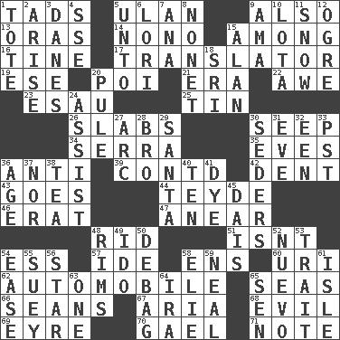 ACROSS 1. Small boys 5. Uhlan (variant) 9. In addition 13. Mouths or openings 14. Words to Nanette 15. Amid 16. Prong on a fork 17. Interpreter 19. Compass dir. 20. Luau course 21. Epoch 22. Deep reverence 23. Son of Isaac 25. Metal container 26. Thick slices 30. Ooze 34. Spanish missionary in California 35. Nights before holidays 36. Opposed to 39. Continued (abbr.) 42. Incision 43. Leaves 44. Miss Universe 1986, Barbara Palacios _ 46. Part of Q.E.F. 47. Approach 48. To free from 51. Is not 54. Curvy letter 57. Binary compound 58. Followers of ems 60. RI univ. 62. Form of transportation 65. Oceans 66. Seines 67. Operatic vocal solo 68. Morally bad or wrong 69. Jane of fiction 70. Highlander 71. Make mention of DOWN 1. Carry 2. Get up 3. Natives or inhabitants of Denmark 4. Compass dir. 5. To (old English) 6. Australian parrot (variant) 7. Santa ___, CA 8. Music written for nine 9. Nanny (var.) 10. Globular water bottle used in Asia 11. Overwhelm 12. Legendary monster 15. ____ Jay Lerner 18. _ Lanka 20. Whine 24. Help 27. Curve 28. Sis' sibling 29. Before Barbara or Clara 30. Spring feasts 31. Night before a holiday 32. Car or cant ending 33. Pacific Standard Time (abbr.) 36. Grow older 37. Or not 38. Afternoon social gathering 40. "___ Little Indians" 41. Color 45. Raised platform 48. Basketball hoops 49. Wedding promise 50. Debunk (Brit. slang) 52. New (sp.) 53. Distinguishing feature 54. Comfort 55. Chop _ 56. Play the lead 58. Writer Wiesel 59. Actress Patricia 61. Small island 63. Single 64. Retirement account (abbr.) 65. Elected rep.