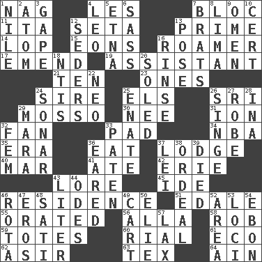 ACROSS 1. Tired old horse 4. French article 7. Alliance 11. Call ___ day 12. Bristle 13. A-one 14. Trim (branches) 15. Immeasurably long periods of time 16. Wanderer 17. Make improvements or corrections to 19. Aide 21. Nine, plus one 23. Singles 24. Male parent of an animal 25. Raised railways 26. Indian title of respect (Mr.) 29. With motion or animation 30. Born 31. Electrically charged atom 32. Air blower 33. Groovy apt. 34. Basketball assoc. 35. Period 36. Ingest 37. Inn 40. Third mo. 41. Had dinner 42. 4th largest of the Great Lakes 43. Old wives' tales, e.g. 45. Binary compound 46. Dwelling 51. Peak District village in England 55. Declaimed 56. Silent film actress Nazimova 58. Director Reiner 59. Lugs 60. Monetary unit of Yemen 61. Environmental prefix 62. SW Saudi Arabia district 63. John Ritter's dad 64. The 18th letter of the Arabic alphabet DOWN 1. "Death on the ____" 2. Tiny particle 3. Stare wonderingly 4. Lion 5. Inactive volcano in Sicily 6. Backtalk 7. Naughty children 8. Pale green bean 9. Sign of something about to happen 10. An absolute certainty 12. Spring feasts 13. Airs 16. Remove soap 18. Nuclear Threat Initiatives 20. Having a sole or soles 22. Modern: prefix 24. Echolocation 25. Maternal 26. Burn superficially 27. Loose flowing garment 28. _ tizzy (2 wds.) 29. Hindu Mythology: god of death 32. Opposite of masc. 33. Eucharist need 36. Having ears or earlike features 37. Luau accessory 38. Severe or trying experience 39. Passed on 43. 61 cubic inches 44. Lyric poems 46. Roll call or roster of names 47. Greek god of love 48. Suttee (variant) 49. Draw slowly or heavily 50. Writer Wiesel 52. Length times width 53. Venues 54. Inky black, to poets 57. Not strict