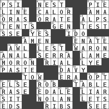 ACROSS 1. 23rd letter of the Greek alphabet 4. A home for chicks 8. Sliced dessert 11. Actor's bit 13. Bodily heat indicating an inflammation 15. Housemaid (var.) 16. Mouths or openings 17. Declaim 18. High mountains 19. Portable shelters 21. Commissioned military rank (abbr.) 22. Trial 23. Compass dir. 24. It is so 27. Wedding promise 29. So be it 30. Maternal 34. Leather borer 36. For fear that 39. Make _____ (do battle with) 40. Of or related to the anus 41. Father Junipero _ 43. Unable to walk 44. Person of subnormal intelligence 46. Monetary unit of Yemen 47. Sodium hydroxide 48. Thick mixture 49. _ Jones' Locker 51. Pull behind 53. Period 54. Choose 57. Otherwise 60. Director Reiner 63. Eating place 65. Raze (variant) 66. Peak District village in England 69. One who doesn't tell the truth 70. Be seated 71. Pitcher Ryan 72. Allows 73. Begley and Asner 74. Chest bones 75. Observe DOWN 1. Secret plans 2. Fathers 3. Empty; void 4. Non-commissioned officer (abbr.) 5. Ewer handle 6. Volcanic refuse 7. Carry 8. Diluted with white 9. Naughty children 10. 90 degrees 12. Eastern Standard Time (abbr.) 14. Painter Guido (1575-1642) 18. Without tonality 20. Symbol (abbr.) 25. Snakelike fish 26. Scornful expression 28. Morning condensation 29. One to whom something is allotted 31. Like ___ of sunshine 32. Heavy book 33. Compass dir. 34. Small Philippine buffalo 35. Armed conflicts 37. Indian title of respect (Mr.) 38. Buy and sell 40. Electrical Unit 42. Having or resembling wings 45. Modern: prefix 50. Large container 52. Songbird 54. Off-Broadway awards 55. Food holder 56. Laconic 57. Celtic language 58. Put down 59. Fast planes 61. Aroma 62. Indonesian resort city 64. 100% 67. Experiment locale 68. Followers of ems