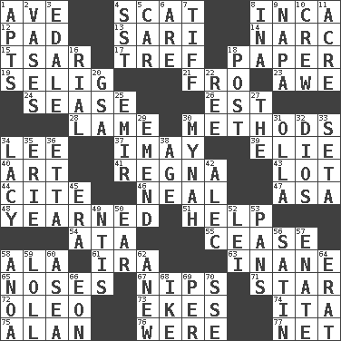 ACROSS 1. "___ Maria" 4. Jazz singing style 8. South American Indian 12. Groovy apt. 13. Indian skirt 14. Drug cop 15. Russian ruler of old 17. Not kosher 18. Some stationery 19. Former Milwaukee Brewers owner Bud 21. Away 23. Deep reverence 24. Gospel singer Marvin 26. Eastern Standard Time (abbr.) 28. Unable to walk 30. Modes 34. Area sheltered from the wind 37. "If ____ say so..." 39. Writer Wiesel 40. Nonscientific branch of learning 41. Rain (Swedish) 43. Car dealer's back yard 44. Quote 46. Be tempered by heat 47. White ___ sheet 48. Had a strong desire 51. Assist 54. "One Day ___ Time" 55. Desist 58. In the manner of 61. Retirement account (abbr.) 63. Lacking in sense or substance 65. Olfactory organs 67. Cuts off 71. Play the lead 72. Butter sub 73. Supplements with great effort 74. Call ___ day 75. Actor Alda or Thicke 76. We are 77. Fish or hair follower DOWN 1. Flats, for short 2. Flower holders 3. Peak District village in England 4. Fast jet (abbr.) 5. Automobile 6. "We ___ not amused" (Victoria) 7. Small quarrel 8. _ tizzy (2 wds.) 9. California wine valley 10. Ship's personnel 11. 1/640 square mile 16. Monetary unit of Yemen 18. Mail 20. Girls' org. (abbr.) 22. Portuguese money of account (variant) 25. Independent ruler or chieftain 27. Definite Article 29. Make improvements or corrections to 30. Non-adult bird? 31. Water jar 32. "Vaya con ____" 33. Stalk of a moss capsule 34. Made of lace 35. One of the Great Lakes 36. Singer James 38. Grow older 42. Actor Baldwin 45. Period 49. Nuclear Threat Initiatives 50. Hearing organ 52. Luau accessory 53. Zero-star reviews 56. Smooth fabric 57. Maternal 58. Small Philippine buffalo 59. Hang loosely or laxly 60. Toward the sea 62. Afresh 64. Part of Q.E.F. 66. A really long time 68. Mamie's mate 69. For each 70. Compass dir.