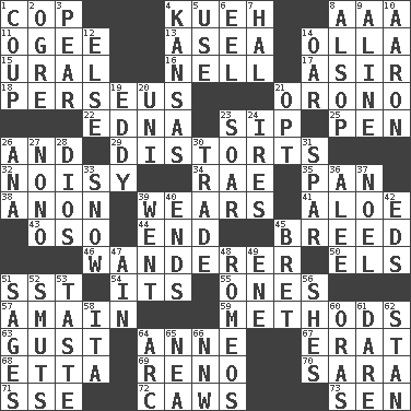 ACROSS 1. Police officer (slang) 4. Malaysian steamed pastry 8. American Automobile Association (abbr.) 11. Double curve, resembling the letter S 13. Toward the sea 14. Spanish pot 15. Mountain range 16. 1994 drama film starring Jodie Foster 17. SW Saudi Arabia district 18. Son of Zeus who helped slay Medusa 21. U. of Maine site 22. Pulitzer Prize-winning author Ferber 23. Small drink 25. Animal enclosure 26. Plus 29. What propaganda does 32. Annoyingly loud 34. Actress Charlotte 35. Baking dish 38. At once, immediately (arch.) 39. Puts on (as clothing) 41. Medicinal plant 43. Bear (Spanish) 44. Conclude 45. A special lineage 46. Roamer 50. Raised railways 51. Fast jet (abbr.) 54. ___ a Wonderful Life 55. Washington bills 57. At full speed 59. Modes 63. Abrupt rush of wind 64. Singer Murray 67. Part of Q.E.F. 68. Singer James 69. Western Nevada city 70. "Two Mules for Sister ____" 71. Compass dir. 72. Crow sounds 73. Elected rep. DOWN 1. Overturn; upset 2. Legendary monster 3. Lightbulb-shaped fruit 4. Sunflower state 5. Purpose 6. Snakelike fish 7. Actor Linden 8. Columnist Joseph or Stewart 9. Place in a line 10. Composer Copland 12. Otherwise 14. Boat paddle 19. Whirlpool 20. Single; one (prefix) 21. Choose 23. Fly high 24. Angers 26. Santa ___, CA 27. Words to Nanette 28. "Vaya con ____" 30. Exchange 31. Practice fight 33. Frozen precipitation 36. Toward shelter 37. Christmas carol 39. Left 40. Conclusions 42. Begley and Asner 45. Cy Young winner Saberhagen 47. The 18th letter of the Arabic alphabet 48. Lover boys 49. Compass dir. 51. Gurus 52. Obscenities 53. Clothes sense 56. "______ My Girl" (Turtles hit) 58. Call ___ day 60. Mouths or openings 61. Have the gumption 62. Comedian Laurel of Laurel & Hardy 64. Curve 65. Teachers' org. 66. Compass dir.